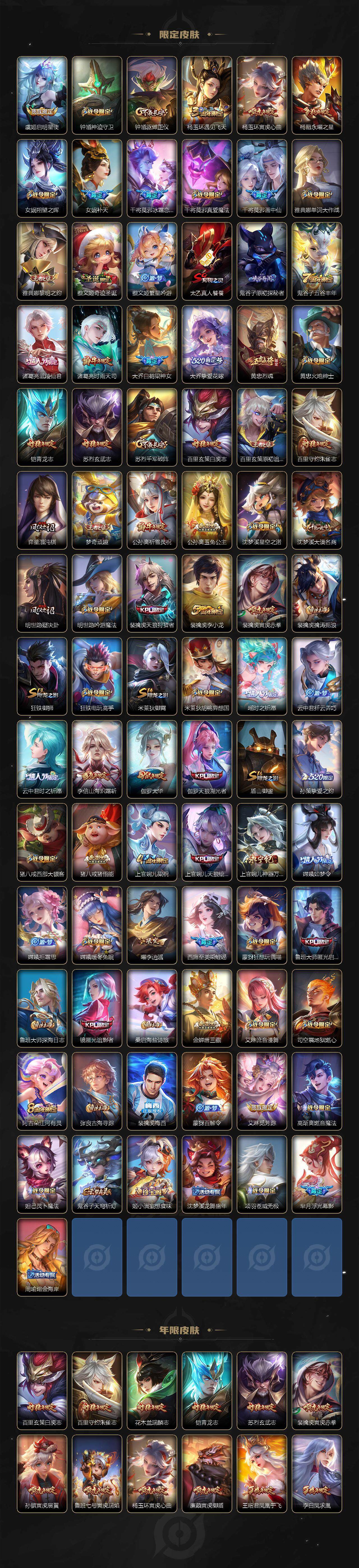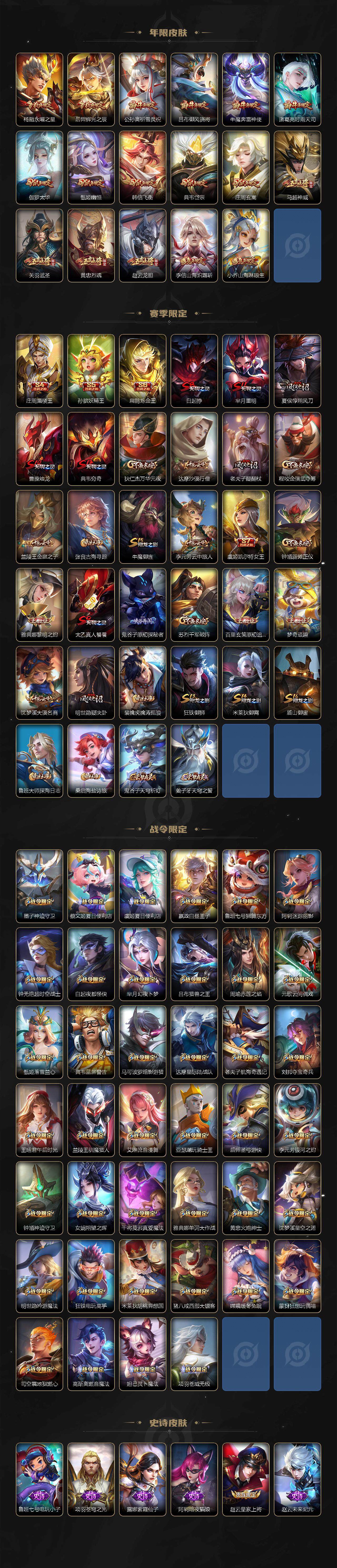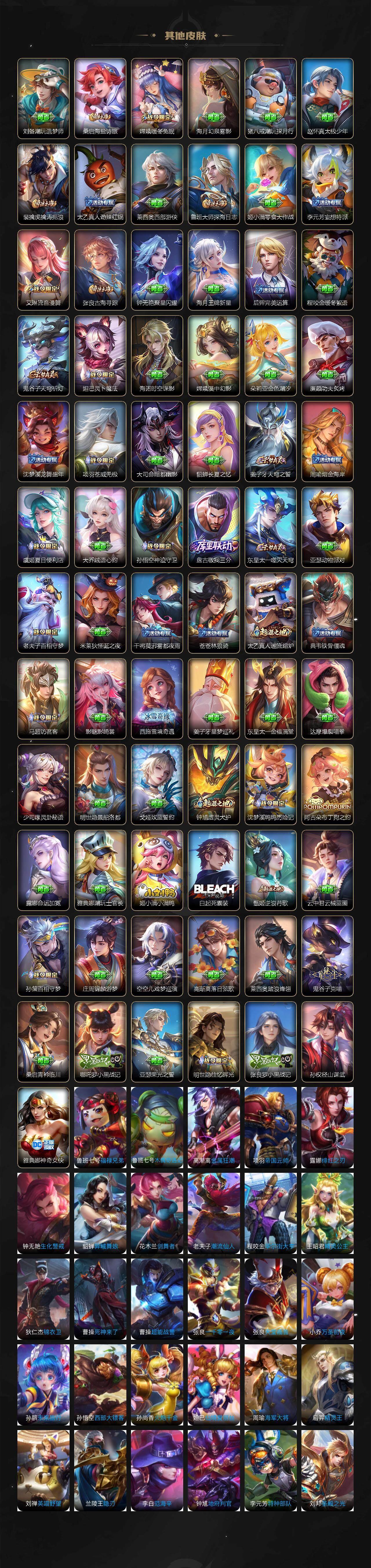 关羽冰锋战神,裴擒虎李小龙,上官婉儿梁祝,牛魔奔雷神使,公孙离祈雪灵祝,吕布御风骁将,诸葛亮时雨天司,赵云龙胆,关羽武圣,黄忠烈魂,马超神威,后羿辉光之辰,庄周玄嵩,典韦岱宗,甄姬幽恒,韩信飞衡,伽罗太华,曹操天狼征服者,裴擒虎天狼狩猎者,孙膑天狼运算者,上官婉儿天狼绘梦者,伽罗天狼溯光者,马可波罗逐梦之星,韩信逐梦之影,铠青龙志,百里玄策白虎志,花木兰瑞麟志,苏烈玄武志,百里守约朱雀志,王昭君凤凰于飞,项羽霸王别姬,虞姬霸王别姬,孙悟空大圣娶亲,露娜一生所爱,花木兰默契交锋,兰陵王默契交锋,后羿如梦令,嫦娥如梦令,孙悟空至尊宝,裴擒虎梅西,雅典娜神奇女侠,妲己热情桑巴,干将莫邪冰霜恋舞曲,花木兰青春决赛季,蔡文姬奇迹圣诞,妲己时之彼端,芈月白晶晶,赵云引擎之心,庄周云端筑梦师,鲁班七号乒乒小将,大乔白鹤梁神女,猪八戒猪悟能,廉颇寅虎·御盾,孙尚香异界灵契,孙悟空孙行者,甄姬女儿国国王,镜匿光追影者,韩信傲雪梅枪,鲁班七号寅虎·瑞焰,孙膑寅虎·展翼,杨玉环寅虎·心曲,裴擒虎寅虎·赤拳,云中君时之祈愿,瑶时之祈愿,女娲补天,赵云百木心枪,公孙离玉兔公主,露娜启示之音,夏侯惇匿光决锋者,后羿无尽星芒,马可波罗深海之息,金蝉唐三藏,娜可露露前尘镜,橘右京枫霜尽,鲁班大师匿光启智者,妲己时之奇旅,王昭君星穹之声,不知火舞绯月行,上官婉儿神器·万象笔,西施至美·乘鲤谣,夏侯惇霜北刀,桑启鸣野蒿,艾琳陌上桑,澜愿照·九州拓,蔡文姬愿照·福禄聚,虞姬愿照·岁时盈,司空震愿照·山河定,妲己愿照·众生和,女娲愿照·千秋盛