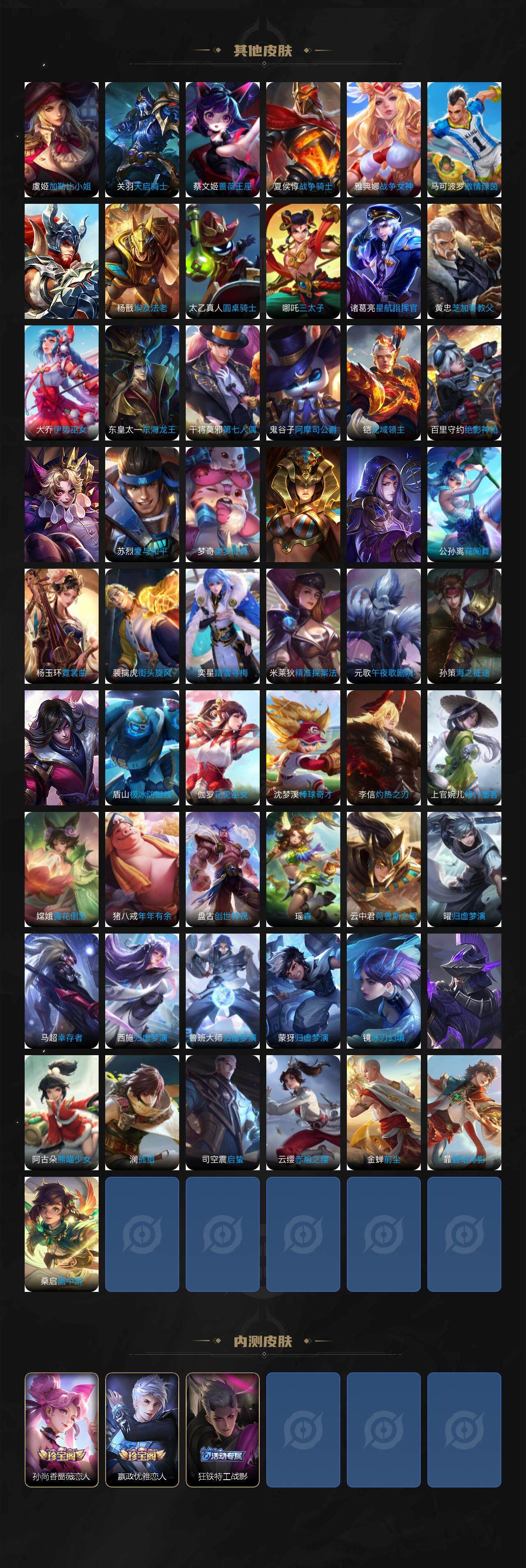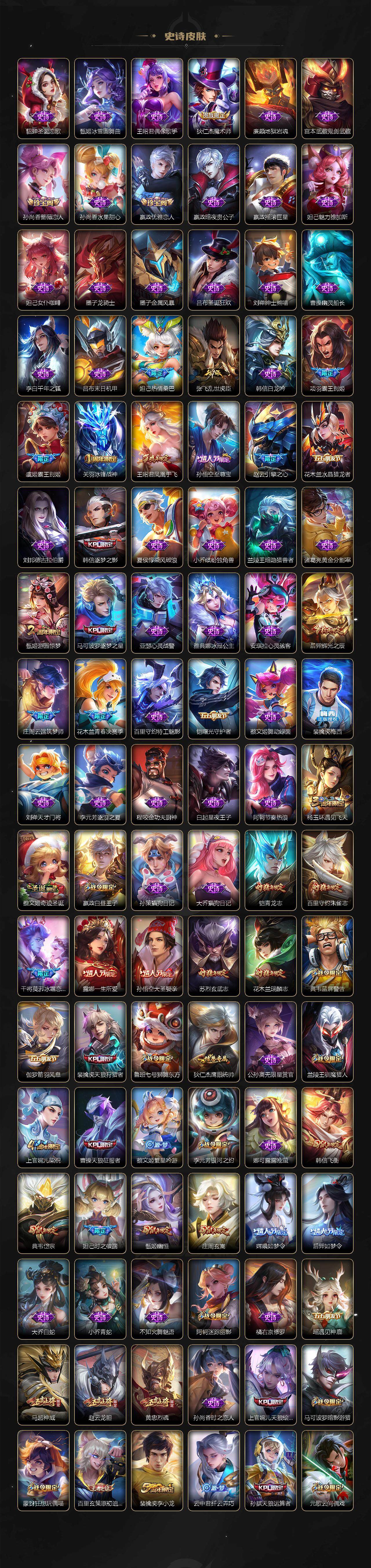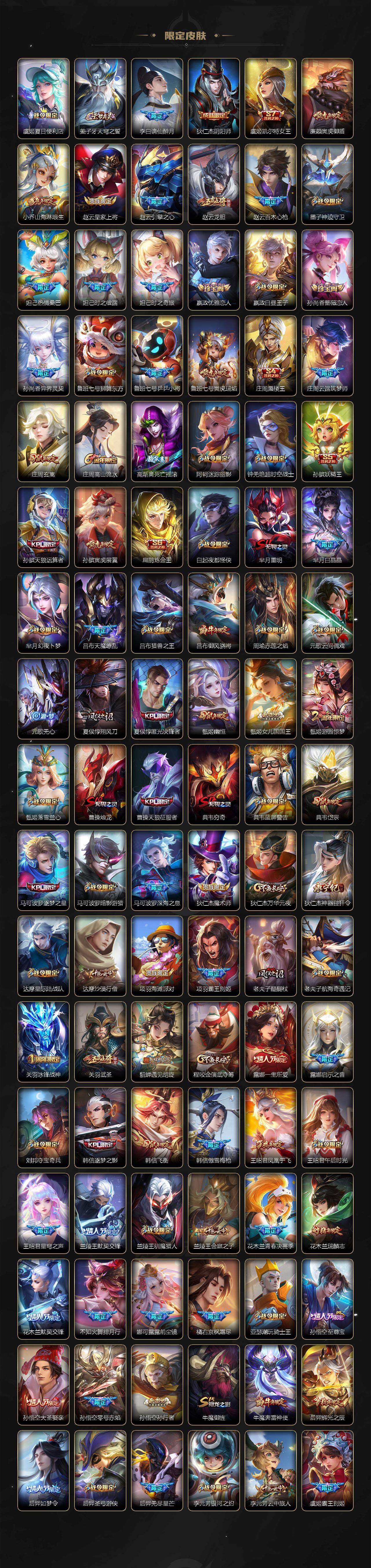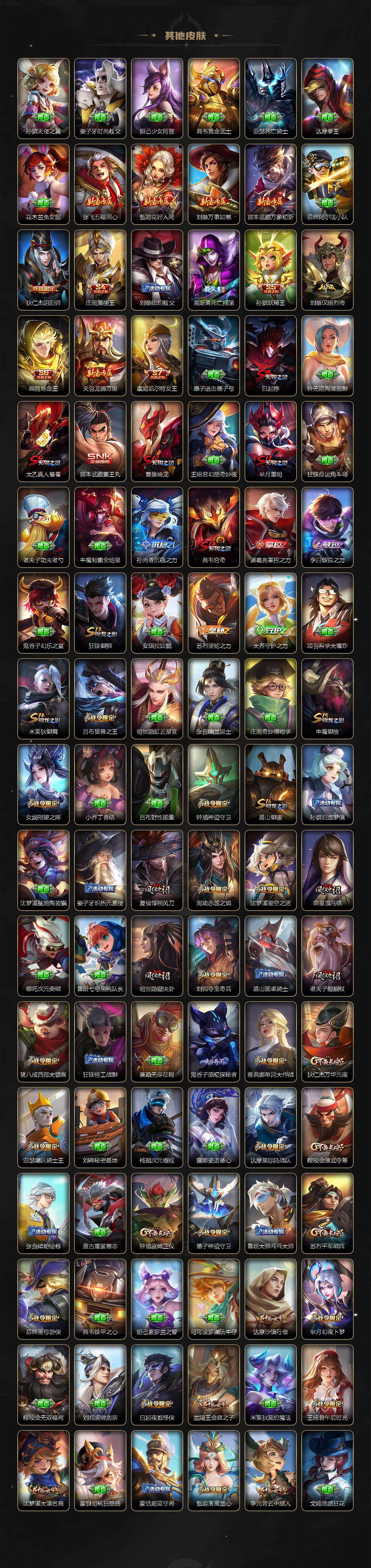 关羽冰锋战神,裴擒虎李小龙,上官婉儿梁祝,牛魔奔雷神使,公孙离祈雪灵祝,吕布御风骁将,诸葛亮时雨天司,赵云龙胆,关羽武圣,黄忠烈魂,马超神威,后羿辉光之辰,庄周玄嵩,典韦岱宗,甄姬幽恒,韩信飞衡,伽罗太华,曹操天狼征服者,裴擒虎天狼狩猎者,孙膑天狼运算者,上官婉儿天狼绘梦者,伽罗天狼溯光者,马可波罗逐梦之星,韩信逐梦之影,铠青龙志,百里玄策白虎志,花木兰瑞麟志,苏烈玄武志,百里守约朱雀志,王昭君凤凰于飞,项羽霸王别姬,虞姬霸王别姬,孙悟空大圣娶亲,露娜一生所爱,花木兰默契交锋,兰陵王默契交锋,后羿如梦令,嫦娥如梦令,孙悟空至尊宝,裴擒虎梅西,雅典娜神奇女侠,妲己热情桑巴,干将莫邪冰霜恋舞曲,花木兰青春决赛季,蔡文姬奇迹圣诞,妲己时之彼端,芈月白晶晶,赵云引擎之心,庄周云端筑梦师,鲁班七号乒乒小将,大乔白鹤梁神女,猪八戒猪悟能,廉颇寅虎·御盾,孙尚香异界灵契,孙悟空孙行者,甄姬女儿国国王,镜匿光追影者,韩信傲雪梅枪,鲁班七号寅虎·瑞焰,孙膑寅虎·展翼,杨玉环寅虎·心曲,裴擒虎寅虎·赤拳,云中君时之祈愿,瑶时之祈愿,女娲补天,赵云百木心枪,公孙离玉兔公主,露娜启示之音,夏侯惇匿光决锋者,后羿无尽星芒,马可波罗深海之息,金蝉唐三藏,娜可露露前尘镜,橘右京枫霜尽,鲁班大师匿光启智者,妲己时之奇旅,王昭君星穹之声,不知火舞绯月行,上官婉儿神器·万象笔,西施至美·乘鲤谣,夏侯惇霜北刀,桑启鸣野蒿,艾琳陌上桑,澜愿照·九州拓,蔡文姬愿照·福禄聚,虞姬愿照·岁时盈,司空震愿照·山河定,妲己愿照·众生和,女娲愿照·千秋盛
