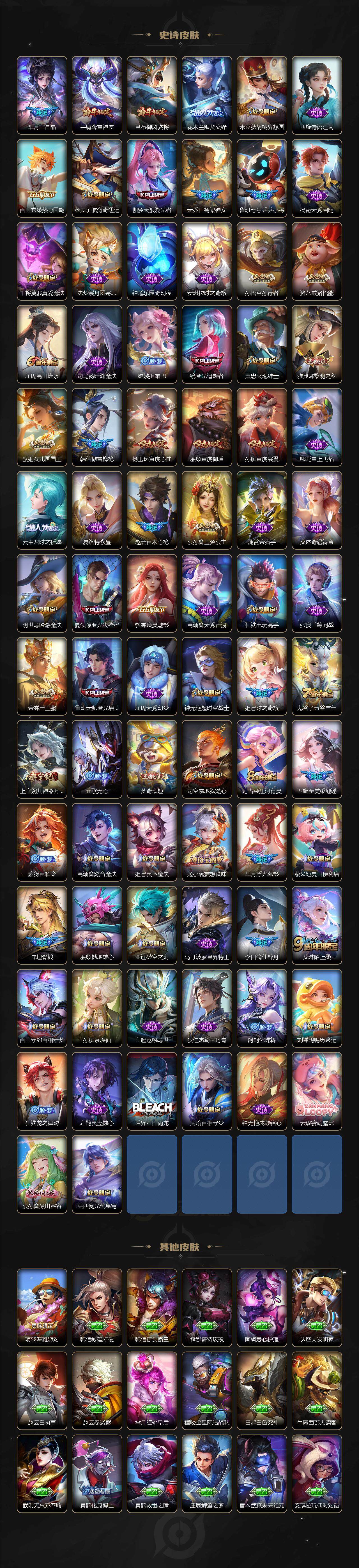庄周蜃楼王,孙膑妖精王,扁鹊炼金王,虞姬凯尔特女王,白起狰,太乙真人饕餮,曹操烛龙,芈月重明,典韦穷奇,狂铁御狮,米莱狄御霄,牛魔御旌,盾山御銮,夏侯惇朔风刀,明世隐疑决卦,老夫子醍醐杖,鬼谷子原初探秘者,狄仁杰万华元夜,程咬金演武夺筹,钟馗驱傩正仪,苏烈千军破阵,吕布猎兽之王,嬴政白昼王子,女娲朔望之晖,典韦蓝屏警告,钟馗神迹守卫,鲁班七号狮舞东方,沈梦溪星空之诺,李元芳银河之约,刘邦夺宝奇兵,马可波罗暗影游猎,蒙犽狂想玩偶喵,元歌云间偶戏,弈星混沌棋,达摩沙漠行僧,兰陵王金庭之子,沈梦溪大漠名商,李元芳云中旅人,桑启海盐诗旅,裴擒虎擒涛扼浪,鲁班大师探海日志,张良古海寻踪,项羽苍威无极