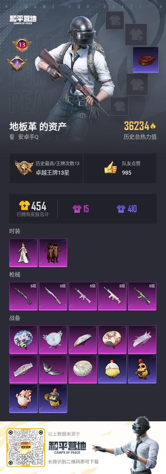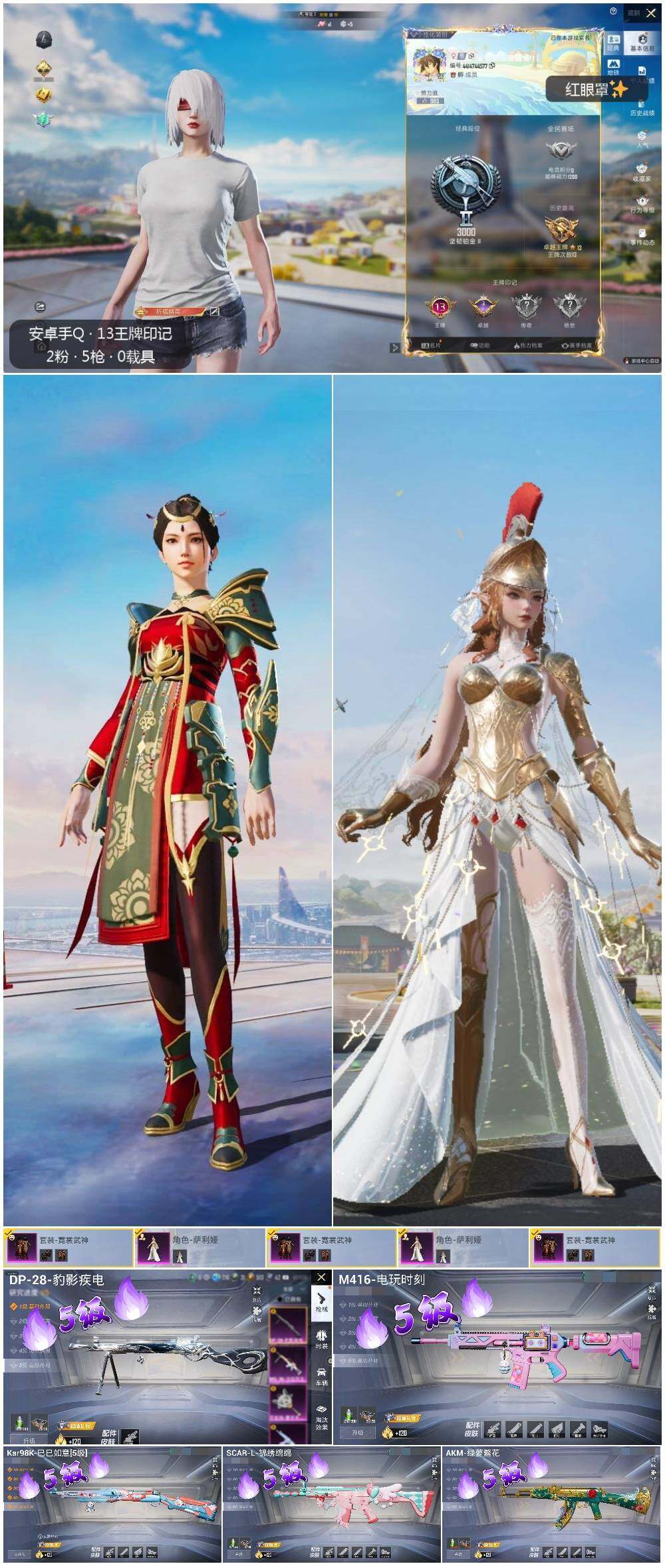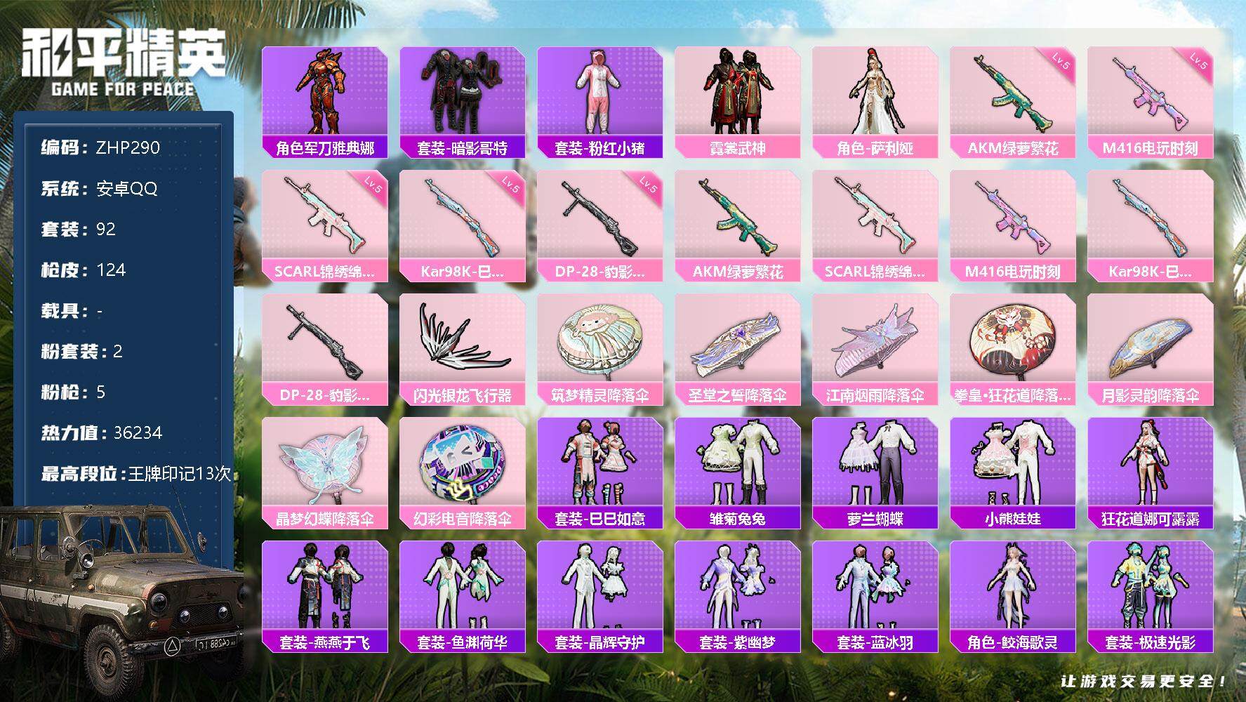 [12950023]安卓 手Q-2粉装-5特效枪-1粉色飞行器-3.6w热力值-13王牌印记-92套装-124枪皮【热门品类】:角色-军刀雅典娜,套装-暗影哥特,套装-粉红小猪【粉色套装】:粉装-霓裳武神,角色-萨利娅【粉色枪皮等级】:AKM-绿萝繁花(五级),SCAR-L-锦绣绵绵(五级),M416-电玩时刻(五级),Kar98K-巳巳如意(五级),DP-28-豹影疾电(五级)【粉色飞行器】:闪光银龙飞行器