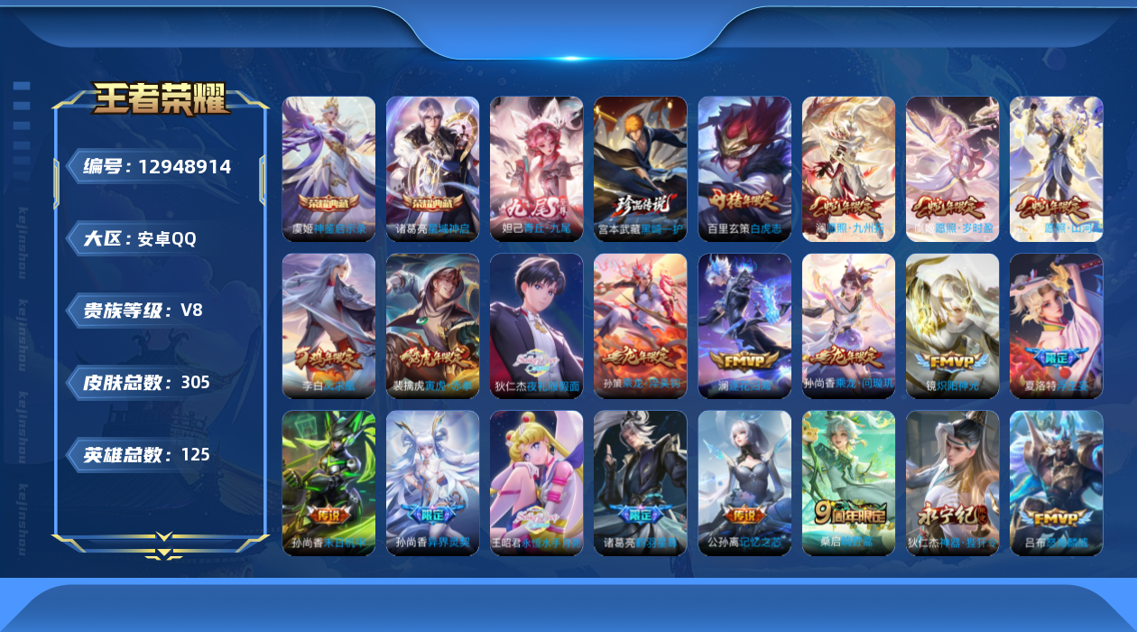 [12948914]安卓Q-V8-最强王者段位-125英雄-305皮肤-2典藏-0珍品无双-1无双-1珍品传说-29传说-97史诗