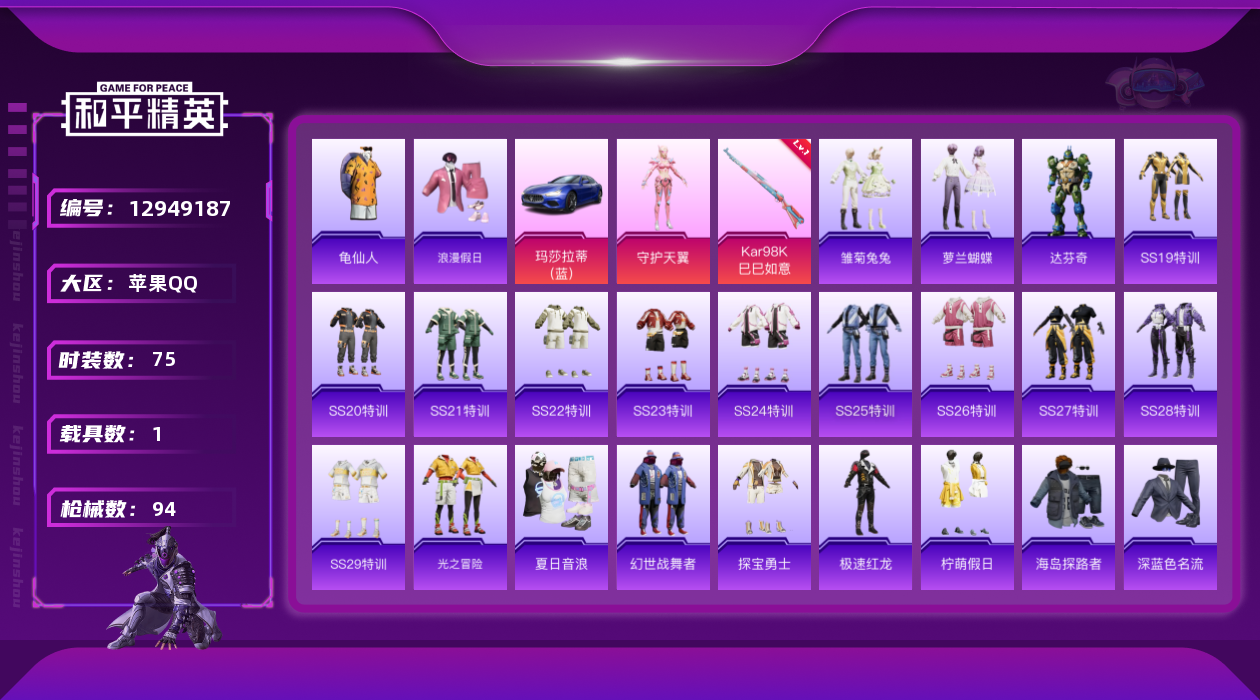 [12949187]【特价急出/详情看图】:苹果 手Q-1粉装-1特效枪-1载具-2.6w热力值-5王牌印记-75套装-94枪皮【热门品类】:套装-龟仙人【粉色载具】:玛莎拉蒂Ghibli(蓝)【粉色套装】:角色-守护天翼【粉色枪皮等级】:Kar98K-巳巳如意(一级)