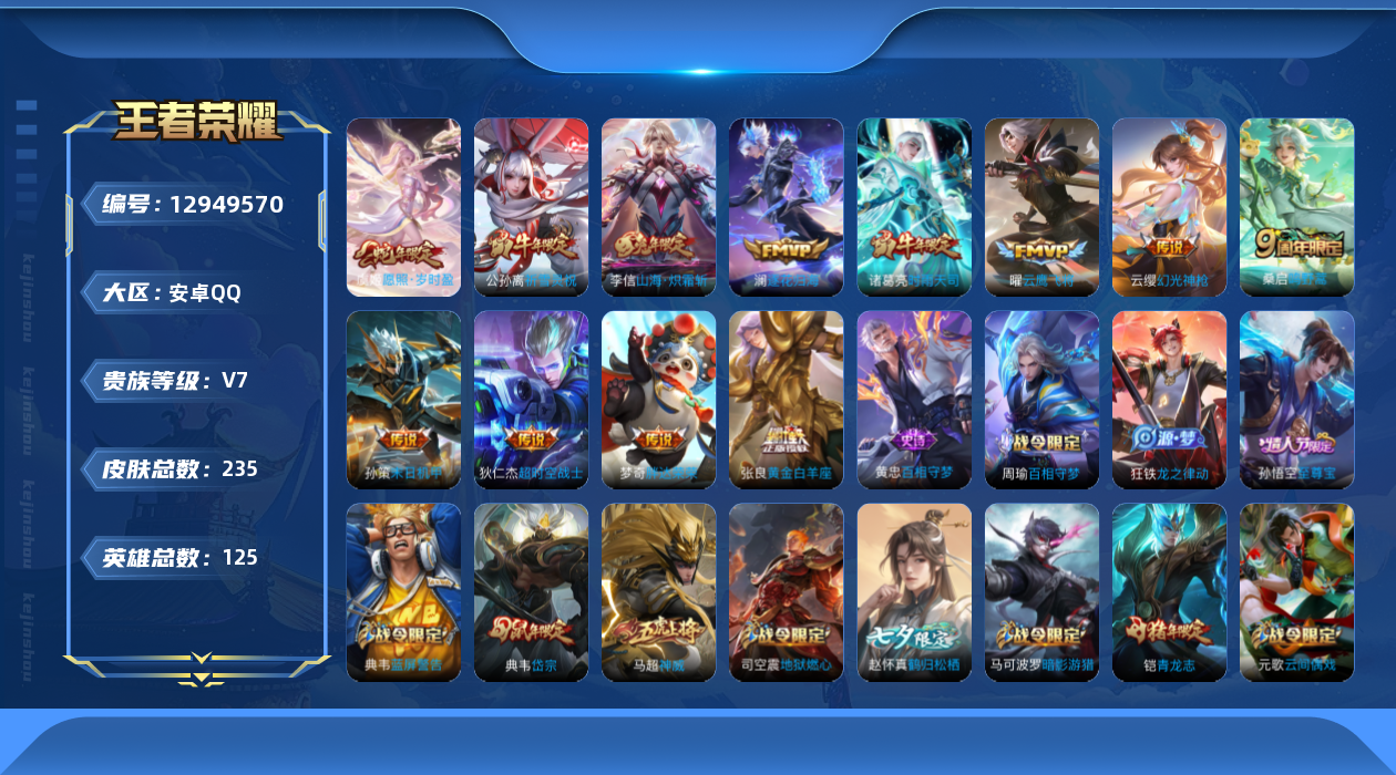 [12949570]【特价急出/详情看图】:安卓Q-V7-最强王者段位-125英雄-235皮肤-12传说-66史诗