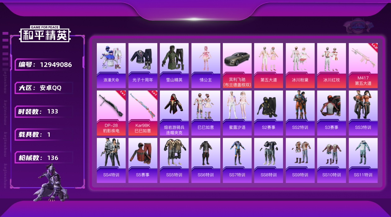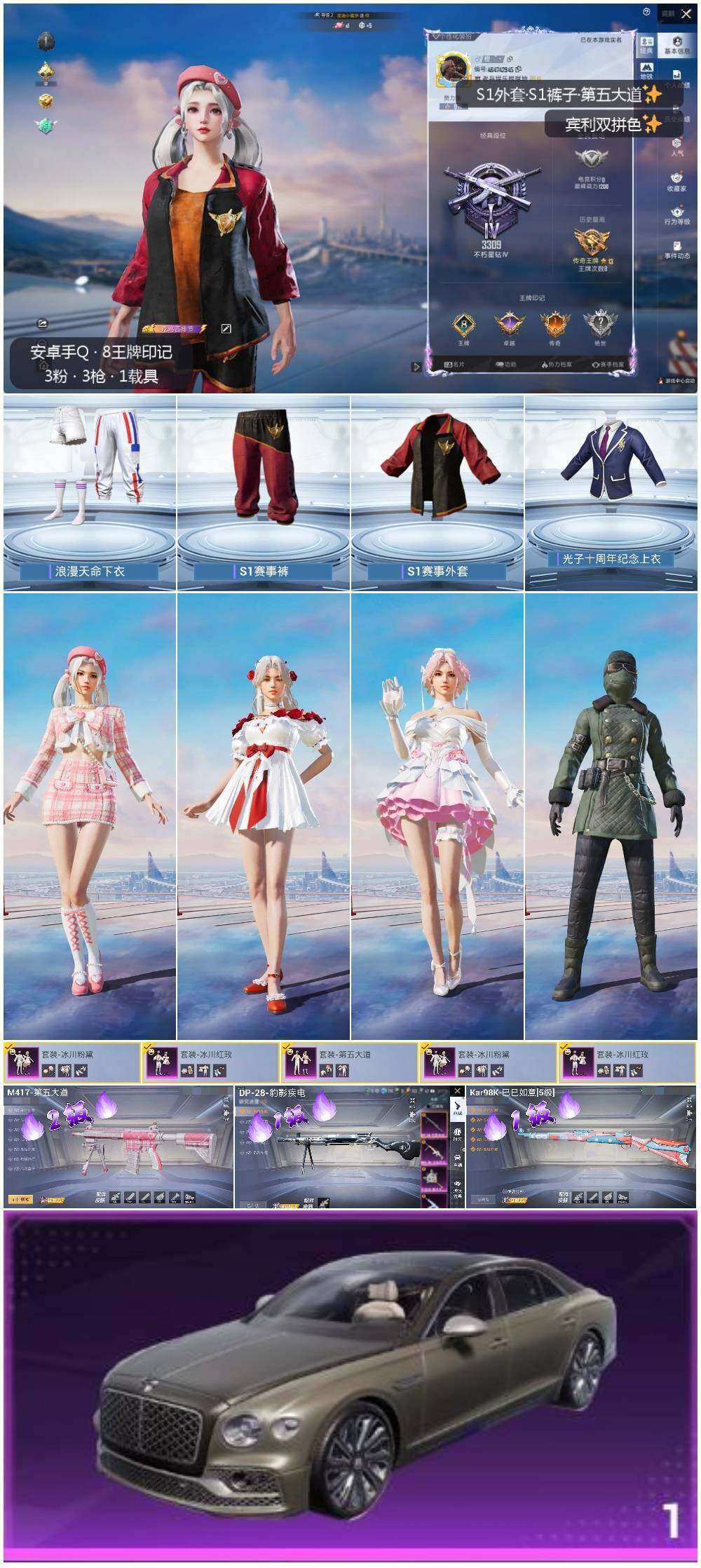 [12949086]s1全套 素材身法号 安卓 手Q-3粉装-3特效枪-1载具-3.8w热力值-8王牌印记-133套装-136枪皮【热门品类】:套装-S1赛事,套装-浪漫天命,小恶魔头饰,熔岩游骑兵面罩,熔岩游骑兵连帽夹克【粉色载具】:宾利飞驰(布罗德盖棕双色)【粉色套装】:粉装-冰川粉黛,粉装-冰川红玫,粉装-第五大道【粉色枪皮等级】:Kar98K-巳巳如意(一级),M417-第五大道(二级),DP-28-豹影疾电(一级)