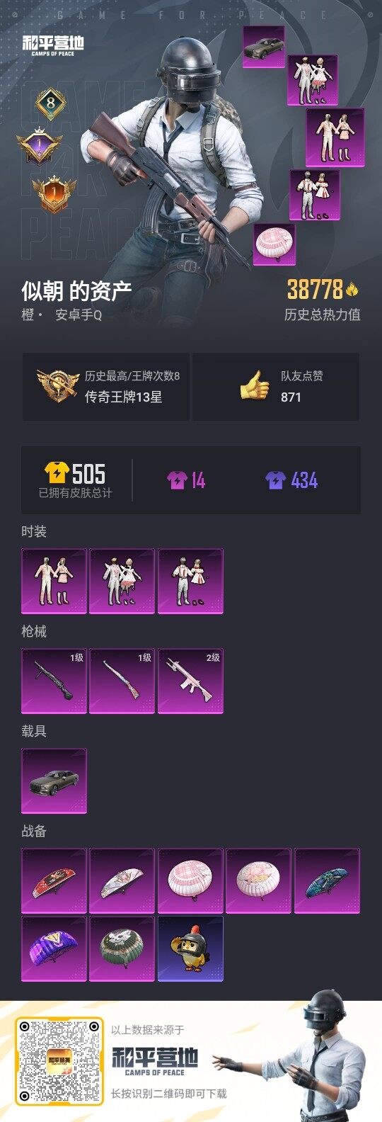 - [13822526]可二次【店主推荐捡漏号!可直接换绑】安卓 微信-20粉装-5特效枪-1载具-9粉色飞行器-51414热力值-5王牌印记-105套装-131枪皮 【热门品类】:粉装-梦幻火箭,套装-龟仙人 【粉色载具】:辉羽雀灵自行车 【粉色套装】:粉装-蝶舞迷情,粉装-梦幻火箭,粉装-冰霜白皇,粉装-香水柠檬,粉装-山涧鹿灵,粉装-恐龙拽拽,粉装-彩虹甜喵,粉装-瑰丽时代,粉装-绿野邂逅,粉装-碧蓝澄空,粉装-黄族统领,角色-白勺歌姬,角色-呆萌星弥,角色-小可学妹,粉装-玉鳞金羽,角色-严莉莉,角色-小蓝,角色-美雪,角色-美琪,粉装-星穹咏叹调 【粉色枪皮等级】:AKS-74U-星穹咏叹调(四级),Kar98K-巳巳如意(一级),DP-28-豹影疾电(五级),MG3-洛神天依(七级),MG3-辉羽雀灵(三级) 【粉色枪皮】:AKS-74U-星穹咏叹调,Kar98K-巳巳如意,DP-28-豹影疾电,MG3-洛神天依,MG3-辉羽雀灵 【粉色飞行器】:梦幻火箭飞行器,黄族统领飞行器,白勺歌姬飞行器,镜域双华-灵镜之阶,霓虹漫游飞行器,幻海精灵飞行器,雀灵庇佑飞行器,灵猫魔法师飞行器 【粉色降落伞】:春暖花开降落伞,梦幻火箭降落伞,星之彼岸降落伞,洛神天依降落伞,恐龙拽拽降落伞,橘柚倾心降落伞,垂柳戏鸭降落伞,彩虹甜喵降落伞,纯梦嫁纱降落伞,梦幻舞会降落伞,黄族统领降落伞,白勺歌姬降落伞,玉鳞金羽降落伞,镜域双华降落伞,巴啦啦小魔仙降落伞,精灵梦叶罗丽降落伞,星穹咏叹调降落伞,辉羽雀灵降落伞 【稀有套装】:套装-龟仙人,角色-许七安,角色-临安公主,套装-粉恋花,套装-紫幽梦,套装-蓝冰羽,套装-星影赞美诗,套装-星渊小夜曲 【稀有枪皮】:SCAR-L-幽秘魅影,SCAR-L-是爱神辣,M416-彩虹嘻嘻猴,M416-红色方程式,M416-绯红前夜,M416-蓝色火焰,GROZA-恐龙拽拽,GROZA-懵萌河马,GROZA-生命誓言,GROZA-蓝莓炮弹,AUG-耀粉歌者,QBZ-洛神天依,M762-橘柚倾心,Mk47-洛神天依,G36C-镜域双华,G36C-六号树人,G36C-懵萌河马,G36C-星穹咏叹调,AC-VAL-天降萌叽,AC-VAL-快闪甜心,Famas-镜域双华,UZI-幽秘魅影,UMP45-春暖花开,UMP45-涂山之恋,Vector-焰鹰斗篷,MP5K-彩虹嘻嘻