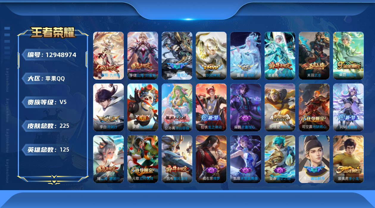 [12948974]打野30段【特价急出/详情看图】:苹果Q-V5-至尊星耀II段位-125英雄-225皮肤-10传说-59史诗