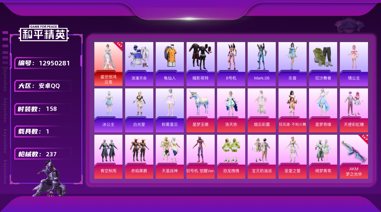 [12950281]素材身法号【特价急出/详情看图】:安卓 手Q-1神装-14粉装-12特效枪-1载具-8粉色飞行器-8w热力值-13王牌印记-158套装-237枪皮【红色神装等级】:盛世惊鸿-云鸾(一级)【热门品类】:粉装-梦幻火箭,套装-浪漫天命,套装-深海小丑鱼,角色-军刀雅典娜,套装-龟仙人,套装-暗影哥特,角色-8号机,角色-Mark.06【粉色载具】:星梦玉骢【粉色套装】:粉装-宝贝奶油派,粉装-天使彩虹糖,粉装-梦幻火箭,粉装-绮梦青鸾,角色-洛天依,粉装-恐龙拽拽,粉装-赤焰黑爵,粉装-青空秋雨,粉装-天星战神,角色-圣堂之誓,角色-烟云彩露,角色-星梦奇缘,角色-初号机 觉醒Ver.,角色-狂花道·不知火舞【粉色枪皮等级】:AKM-梦之光华(七级),AKM-星际浪客(一级),AKM-绿萝繁花(四级),SCAR-L-锦绣绵绵(五级),M416-风花雪月(六级),M416-电玩时刻(五级),UMP45-恐龙拽拽(七级),Kar98K-巳巳如意(五级),Mk14-盛世惊鸿(三级),DP-28-豹影疾电(四级),MG3-洛神天依(七级),PKM-江南烟雨(五级)【粉色飞行器】:相思残雪飞行器,风花雪月飞行器,萌物绒绒飞行器,镜域双华-灵镜之阶,绝色倾城飞行器,龙翔九天飞行器,深渊漩涡飞行器,凤舞九天飞行器