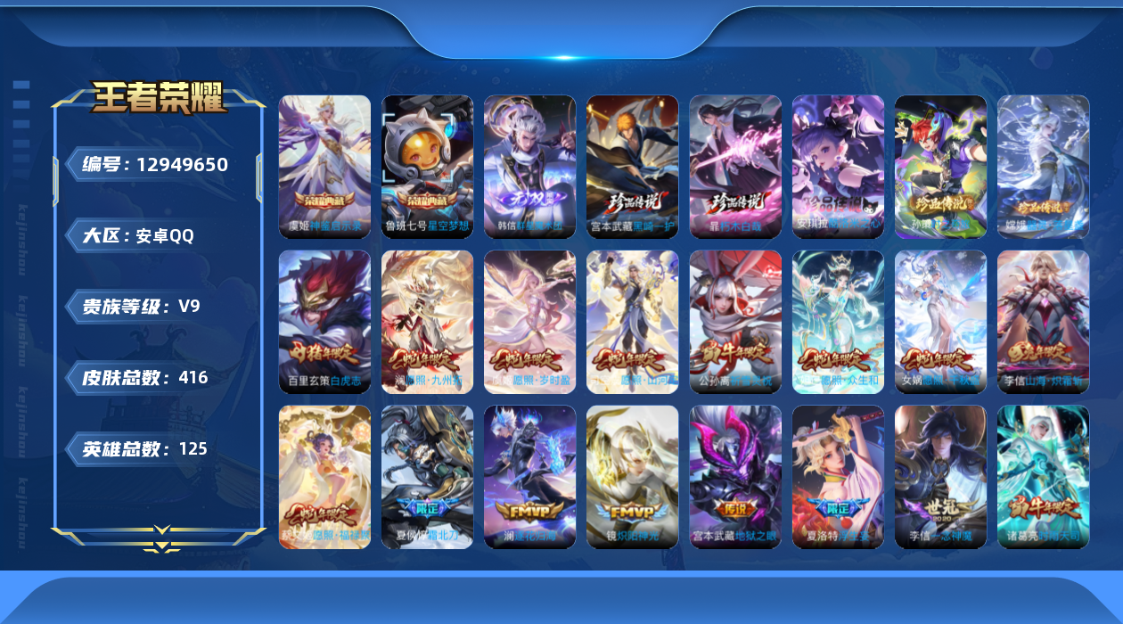 [12949650]【特价急出/详情看图】:安卓Q-V9-至尊星耀IV段位-125英雄-416皮肤-2典藏-1无双-5珍品传说-42传说-118史诗