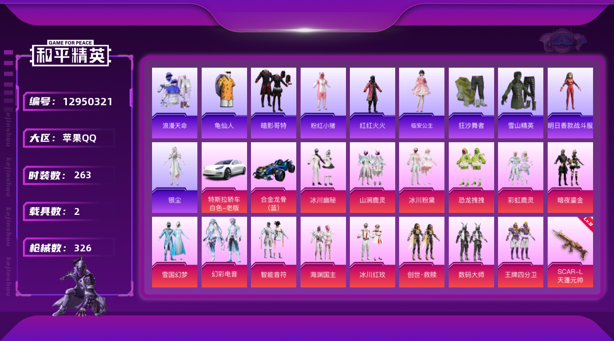 [12950321]素材身法号/地铁满天赋/SCAR-L-天蓬元帅(九级)【特价急出/详情看图】:苹果 手Q-15粉装-8特效枪-2载具-1粉色飞行器-10.8w热力值-23王牌印记-263套装-326枪皮【热门品类】:粉装-雪国幻梦,粉装-梦幻火箭,套装-浪漫天命,套装-深海小丑鱼,套装-奇异狩猎者,角色-军刀雅典娜,套装-金羽特工,套装-AG战队服,套装-SS1特训,旭日初心兜帽大衣,套装-龟仙人,套装-暗影哥特,套装-粉红小猪,套装-红红火火,熔岩游骑兵面罩,熔岩游骑兵连帽夹克【粉色载具】:特斯拉Model 3(珍珠白),合金龙骨(蓝)【粉色套装】:粉装-数码大师,粉装-雪国幻梦,粉装-梦幻火箭,粉装-智能音符,粉装-王牌四分卫,粉装-彩虹鹿灵,粉装-山涧鹿灵,粉装-海渊国主,粉装-恐龙拽拽,粉装-冰川粉黛,粉装-冰川幽秘,粉装-冰川红玫,粉装-暗夜鎏金,套装-创世·救赎,粉装-幻彩电音【粉色枪皮等级】:AKM-炫紫旋律(七级),SCAR-L-天蓬元帅(九级),M416-心之恋语(七级),GROZA-镜光银凌(五级),UMP45-量子极限(五级),Kar98K-巳巳如意(五级),莫辛纳甘-未来领航者(七级),DP-28-豹影疾电(五级)【粉色飞行器】:林间仙鹿飞行器