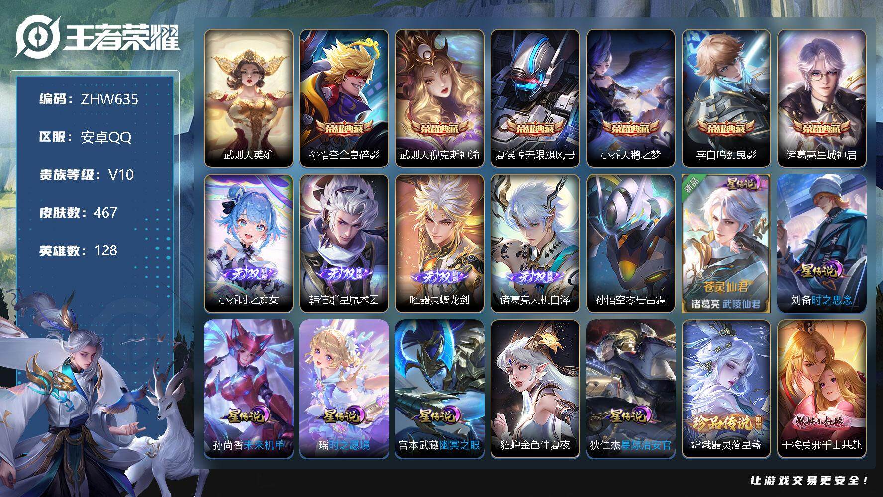 [12949136]安卓Q-V10-至尊星耀I段位-128英雄-467皮肤-6典藏-8星传说-4无双-1珍品传说-48传说-158史诗 【英雄全皮】:元歌全皮,刘邦全皮,孙权全皮,鬼谷子全皮,狂铁全皮,蒙恬全皮,司空震全皮,戈娅全皮,空空儿全皮 【荣耀典藏】:武则天英雄,孙悟空全息碎影,武则天倪克斯神谕,夏侯惇无限飓风号,小乔天鹅之梦,李白鸣剑曳影,诸葛亮星域神启 【无双皮肤】:小乔时之魔女,韩信群星魔术团,曜器灵螭龙剑,诸葛亮天机白泽 【珍品传说】:嫦娥器灵落星盏 【传说皮肤】:干将莫邪千山共赴,元歌诡秘之主,后羿千劫归真,司空震愿照山河定,女娲愿照千秋盛,妲己愿照众生和,澜愿照九州拓,蔡文姬愿照福禄聚,虞姬愿照岁时盈,桑启鸣野蒿,艾琳觅芳踪,大乔挚爱花嫁,孙策挚爱之约,女娲补天,孙策末日机甲,瑶时之祈愿,裴擒虎寅虎赤拳,鲁班七号寅虎瑞焰,孙尚香异界灵契,貂蝉遇见胡旋,赵云淬星耀世,王昭君乞巧织情,西施游龙清影,曜李逍遥 ,周瑜音你心动,小乔音你心动,兰陵王默契交锋,公孙离祈雪灵祝,诸葛亮时雨天司,铠绛天战甲,镜炽阳神光,虞姬启明星使,孙悟空零号赤焰,关羽武圣,曜云鹰飞将,李信一念神魔,刘备时之恋人,貂蝉猫影幻舞,干将莫邪久胜战神,百里玄策白虎志,杨戬永曜之星,诸葛亮武陵仙君,貂蝉仲夏夜之梦,李白凤求凰,孙尚香末日机甲,宫本武藏地狱之眼,武则天海洋之心,狄仁杰超时空战士 【限定皮肤】:白起狰,蒙犽顽岩魄,大乔绒语心约,姜子牙天穹之誓,狄仁杰阴阳师,小乔纯白花嫁,廉颇寅虎御盾,赵云皇家上将,赵云引擎之心,赵云百木心枪,墨子神迹守卫,嬴政白昼王子,孙尚香蔷薇恋人,孙尚香异界灵契,鲁班七号狮舞东方,鲁班七号乒乒小将,鲁班七号寅虎瑞焰,庄周云端筑梦师,庄周高山流水,阿轲迷踪丽影,钟无艳王者之锤,钟无艳超时空战士,孙膑天狼运算者,孙膑寅虎展翼,扁鹊奇幻香踪,白起夜都怪侠,芈月重明,芈月白晶晶,芈月幻夜卜梦,吕布猎兽之王,吕布御风骁将,周瑜真爱至上,周瑜赤莲之焰,元歌云间偶戏,元歌无心,夏侯惇朔风刀,甄姬女儿国国王,甄姬游园惊梦,甄姬落雪兰心,曹操烛龙,典韦穷奇,马可波罗暗影游猎,马可波罗山海玄木吟,狄仁杰魔术师,狄仁杰万华元夜,达摩星际陆战队,达摩沙漠行僧,项羽海滩派对,项羽霸王别姬,老夫子醍醐杖,老夫子航海奇遇记,关羽武圣,貂蝉逐梦之音,貂蝉遇见胡旋,程咬金演武夺筹,露娜一生所爱,刘邦夺宝