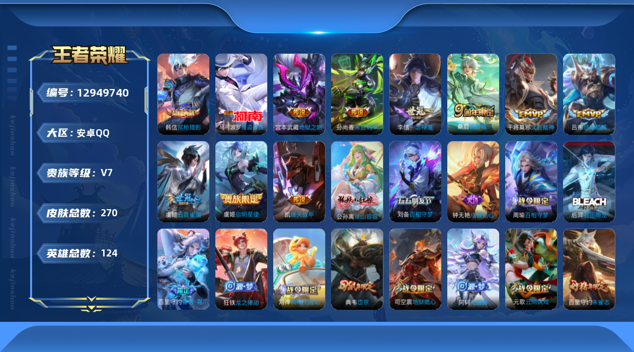 [12949740]【特价急出/详情看图】:安卓Q-V7-最强王者段位-124英雄-270皮肤-1典藏-1珍品传说-9传说-88史诗
