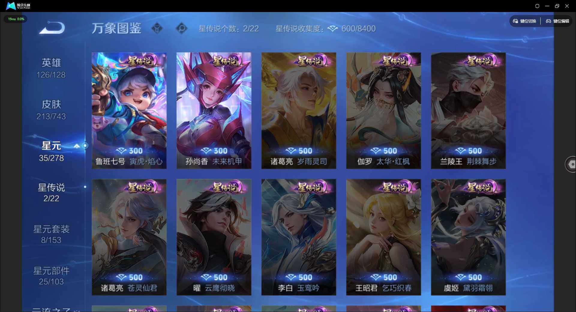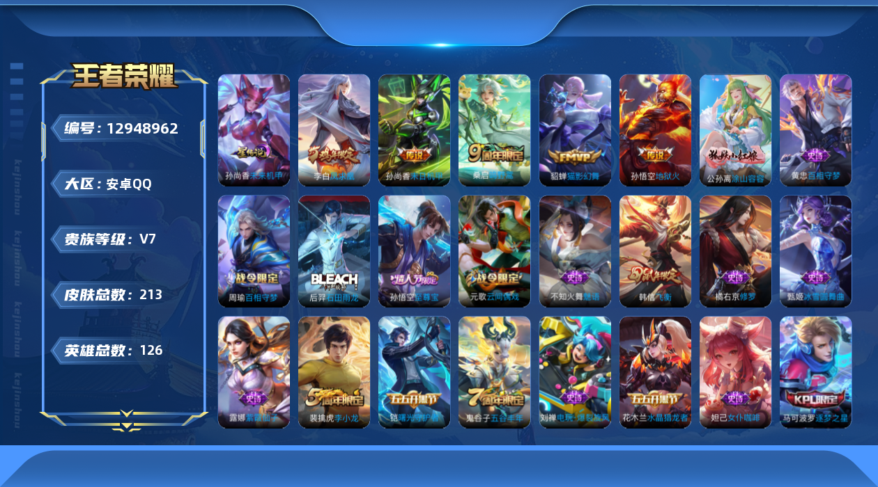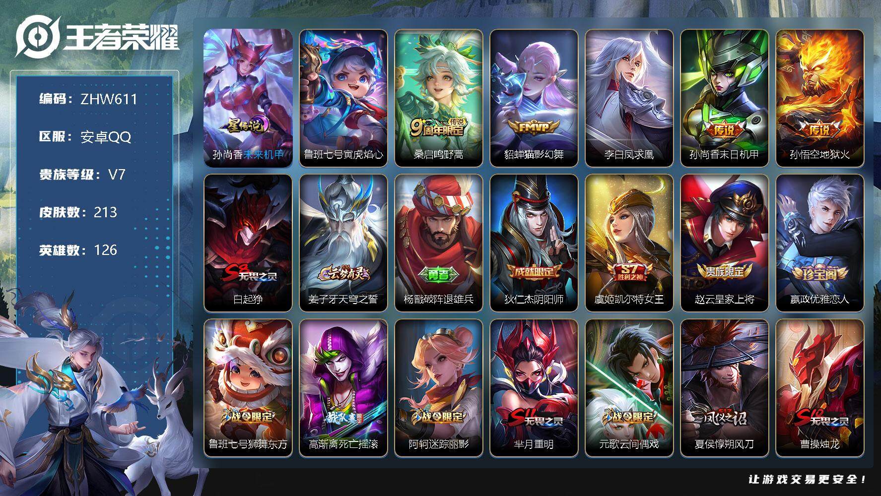 - [12002874]V7 1典藏 7传说 124英雄 337皮肤 可修改实名 优质装备:神鉴启示录,地狱之眼,霜月吟,涂山容容 传说皮:幻光神枪 珍宝阁皮:万物之道,蔷薇恋人,女武神 限定皮:愿照·九州拓(澜年限),逐霄战戟,鸣野蒿,傲雪梅枪,神威(电光马子),遇见飞天,高山流水,怒海麟威,五谷丰年,天狼狩猎者,岱宗(典韦年限),李小龙,猪悟能,大圣娶亲,寅虎·赤拳(老虎年限),神器·万象笔 史诗皮:鸭鸭历险记-刘禅,飞车小橘子,器灵·浮梦炉,化蝶舞,星界战将,谪仙醉月,龙之律动,石田雨龙,百相守梦-周瑜,茶境仙,破空之剑,蔬乡物语(鲁班七号),百相守梦-百里守约,百相守梦-黄忠,遇见神鹿,电玩小子(小书包),黄金分割率,特工魅影,千年之狐,江河有灵,匿光侦查者,魅语,百解令(蒙犽),高渐离燃音魔法,蒙恬荣光圣徽,无限星赏官,冰冠公主,白蛇,晚萤,电玩·爆裂旋风,百相守梦(刘备),末日机甲-吕布,猫狗日记-孙策,猫狗日记-大乔,时之恋人-孙尚香,乱世虎臣,节奏热浪,修罗,女仆咖啡,摇滚巨星,水果甜心,绅士熊喵,天才门将,星夜王子,心灵骇客,功夫厨神,德古拉伯爵,暗隐猎兽者,幽灵船长,鬼剑武藏,心灵战警,舞动绿茵,地狱岩魂,纤云弄巧,繁星吟游(呼啦呼啦),拒霜思,缤纷独角兽,乘风破浪,逐浪之夏,水晶猎龙者,曙光守护者,箭羽风息,唤灵魅影,金属风暴,原初追逐者,圣诞狂欢,圣诞恋歌,鹰眼统帅,暗夜贵公子,魅力维加斯,黎明之约,滕王阁序,无心,未来纪元-赵云