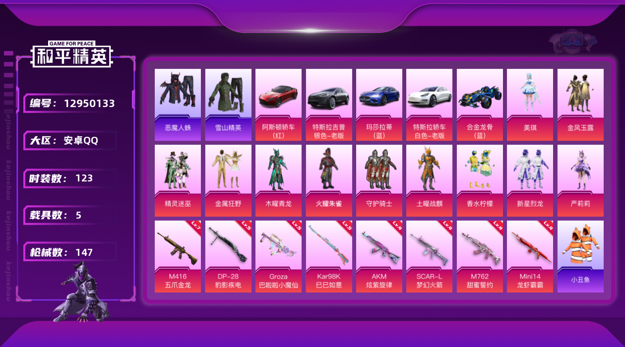 [12950133]素材身法号【特价急出/详情看图】:安卓 手Q-12粉装-8特效枪-5载具-2粉色飞行器-6w热力值-4王牌印记-123套装-147枪皮【热门品类】:粉装-梦幻火箭,套装-小丑鱼,小丑红鼻头,小恶魔头饰【粉色载具】:特斯拉Model 3(珍珠白),特斯拉Model X(冷光银),阿斯顿马丁DBS(红),玛莎拉蒂Ghibli(蓝),合金龙骨(蓝)【粉色套装】:粉装-守护骑士,粉装-火曜朱雀,粉装-土曜战麒,粉装-木曜青龙,粉装-精灵迷巫,粉装-梦幻火箭,粉装-金风玉露,粉装-金属狂野,粉装-新星烈龙,粉装-香水柠檬,角色-严莉莉,角色-美琪【粉色枪皮等级】:AKM-炫紫旋律(四级),SCAR-L-梦幻火箭(四级),M416-五爪金龙(七级),GROZA-巴啦啦小魔仙(五级),M762-甜蜜誓约(四级),Kar98K-巳巳如意(五级),Mini14-龙虾霸霸(四级),DP-28-豹影疾电(五级)【粉色飞行器】:梦幻火箭飞行器