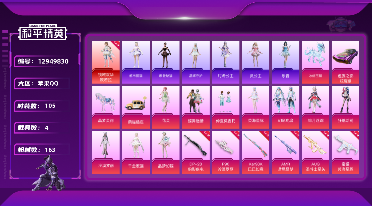 [12949830]素材身法号【特价急出/详情看图】:苹果 手Q-1神装-10粉装-14特效枪-4载具-12粉色飞行器-6.3w热力值-6王牌印记-105套装-163枪皮【红色神装等级】:镜域双华-欧若拉(三级)【粉色载具】:虚妄之影(炫耀紫),萌喵橘座,晶梦灵驹,冰绡玉鳞【粉色套装】:粉装-蝶舞迷情,粉装-仲夏莫吉托,角色-千金淑猫,角色-晶梦幻蝶,粉装-幻彩电音,角色-狂魅哈莉,角色-冷漠罗丽,角色-绯月迷踪,角色-荧海星豚,角色-花灵【粉色枪皮等级】:SCAR-L-金蛇镇世(三级),M416-墨龙九天(三级),AUG-圣斗士星矢(四级),蜜獾-荧海星豚(四级),Vector-最终圣卫者(三级),P90-沙丘之主(三级),P90-冷漠罗丽(五级),Kar98K-巳巳如意(五级),AMR-鸢尾晶梦(五级),DP-28-千金淑猫(四级),DP-28-豹影疾电(五级),平底锅-仲夏莫吉托(二级),烟雾弹-电雾迷城(四级)【粉色飞行器】:沙丘之主天马,镜域双华-灵镜之阶,龙翔九天飞行器,凤舞九天飞行器,戏水时光飞行器,雀灵庇佑飞行器,终晖之翼飞行器,绯月迷踪飞行器,灵猫魔法师飞行器,桃源时光飞行器,灵珠游龙飞行器