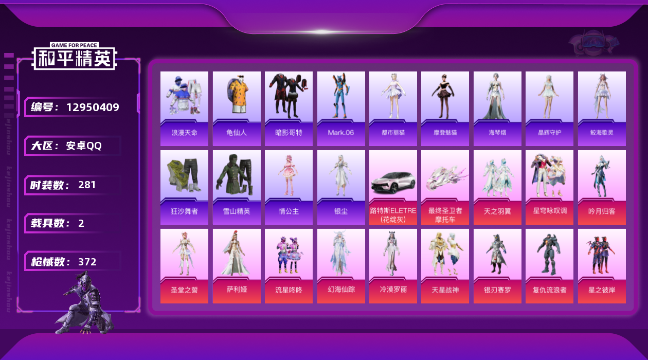 [12950409]素材身法号/无敌战神框1/地铁满天赋 安卓 手Q-无敌战神框-13粉装-10特效枪-2载具-4粉色飞行器-11.7w热力值-20王牌印记-281套装-372枪皮【热门品类】:套装-浪漫天命,套装-深海小丑鱼,套装-小丑鱼,套装-奇异狩猎者,角色-军刀雅典娜,套装-龟仙人,套装-暗影哥特,角色-Mark.06,大砍刀-青龙偃月刀【粉色载具】:路特斯ELETRE(花绽灰),最终圣卫者摩托车【粉色套装】:粉装-银刃赛罗,粉装-星之彼岸,粉装-吟月归客,粉装-流星咚咚,粉装-天之羽翼,角色-复仇流浪者,粉装-天星战神,角色-圣堂之誓,角色-萨利娅,角色-智耀战神,角色-幻海仙踪,粉装-星穹咏叹调,角色-冷漠罗丽【粉色枪皮等级】:AKM-梦之光华(七级),SCAR-L-锦绣绵绵(五级),M416-心之恋语(七级),AUG-星之彼岸(七级),P90-能量风暴(七级),Kar98K-巳巳如意(五级),Mk14-精灵梦叶罗丽(七级),AMR-智耀战神(七级),M249-蓝莓炮弹(七级),DP-28-豹影疾电(五级)【粉色飞行器】:星之彼岸飞行器,夜幕颂歌飞行器,鎏金朋克飞行器,圣域金龙飞行器
