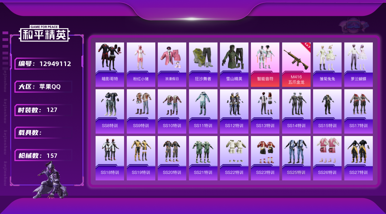 [12949112]无敌战神框1【特价急出/详情看图】:苹果 手Q-无敌战神框-1粉装-1特效枪-4.3w热力值-9王牌印记-127套装-157枪皮【热门品类】:套装-暗影哥特,套装-粉红小猪【粉色套装】:粉装-智能音符【粉色枪皮等级】:M416-五爪金龙(七级)
