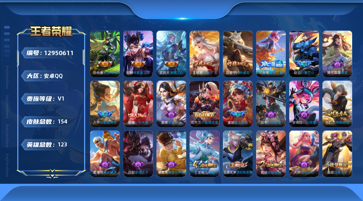 - [13865894]安卓Q-V5-至尊星耀III段位-122英雄-210皮肤-1典藏-0珍品无双-0无双-0珍品传说-4传说-50史诗 【荣耀典藏】:韩信弑枪猎影 【传说皮肤】:桑启鸣野蒿,孙悟空齐天大圣,后羿黄金射手座,宫本武藏地狱之眼 【限定皮肤】:姜子牙天穹之誓,杨戬破阵退雄兵,狄仁杰阴阳师,赵云皇家上将,孙尚香蔷薇恋人,庄周高山流水,高渐离玩趣恶龙,元歌无心,夏侯惇朔风刀,典韦穷奇,狄仁杰魔术师,达摩沙漠行僧,项羽海滩派对,老夫子醍醐杖,韩信傲雪梅枪,王昭君午后时光,兰陵王金庭之子,孙悟空孙行者,孙悟空齐天大圣,李元芳云中旅人,钟馗驱傩正仪,干将莫邪真爱魔法,蔡文姬繁星吟游,鬼谷子原初探秘者,鬼谷子五谷丰年,苏烈千军破阵,弈星混沌棋,梦奇顽趣,沈梦溪大漠名商,明世隐疑决卦,裴擒虎李小龙,裴擒虎擒涛扼浪,狂铁御狮,狂铁电玩高手,米莱狄御霄,猪八戒猪悟能,上官婉儿梁祝,嫦娥暖冬兔眠,西施玲珑珍味,鲁班大师探海日志,桑启海盐诗旅,暃星界游侠,戈娅驭风魔法,阿古朵江河有灵,张良古海寻踪,蒙犽百解令,鬼谷子天穹祈灯,姬小满妄想食味,沈梦溪龙舞盛年,鲁班七号蔬乡物语,李元芳蔬乡物语,刘邦剑破天穹,程咬金群星魔术团,周瑜熔金海岸 【赛季限定】:夏侯惇朔风刀,典韦穷奇,达摩沙漠行僧,老夫子醍醐杖,兰陵王金庭之子,张良古海寻踪,李元芳云中旅人,钟馗驱傩正仪,鬼谷子原初探秘者,苏烈千军破阵,弈星混沌棋,梦奇顽趣,沈梦溪大漠名商,明世隐疑决卦,裴擒虎擒涛扼浪,狂铁御狮,米莱狄御霄,鲁班大师探海日志,桑启海盐诗旅,鬼谷子天穹祈灯,刘邦剑破天穹,姜子牙天穹之誓 【战令限定】:王昭君午后时光,干将莫邪真爱魔法,狂铁电玩高手,嫦娥暖冬兔眠,西施玲珑珍味,暃星界游侠,戈娅驭风魔法,鲁班七号蔬乡物语,李元芳蔬乡物语 【史诗皮肤】:鲁班七号电玩小子,露娜紫霞仙子,阿轲暗夜猫娘,赵云皇家上将,貂蝉圣诞恋歌,甄姬冰雪圆舞曲,王昭君偶像歌手,狄仁杰魔术师,宫本武藏鬼剑武藏,孙尚香蔷薇恋人,孙尚香水果甜心,嬴政摇滚巨星,妲己魅力维加斯,吕布末日机甲,张飞乱世虎臣,花木兰水晶猎龙者,夏侯惇乘风破浪,兰陵王暗隐猎兽者,诸葛亮黄金分割率,安琪拉心灵骇客,百里守约特工魅影,蔡文姬舞动绿茵,刘禅天才门将,李元芳逐浪之夏,程咬金功夫厨神,白起星夜王子,阿轲节奏热浪,伽罗箭羽风息,狄仁杰鹰眼统帅,上官婉儿梁祝,蔡文姬繁星吟游,裴擒虎