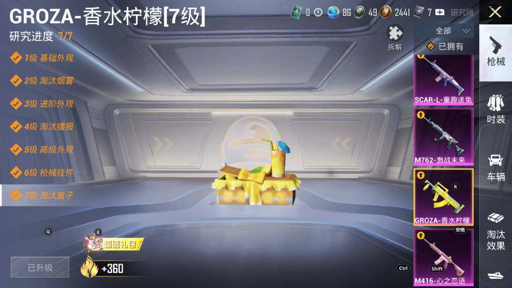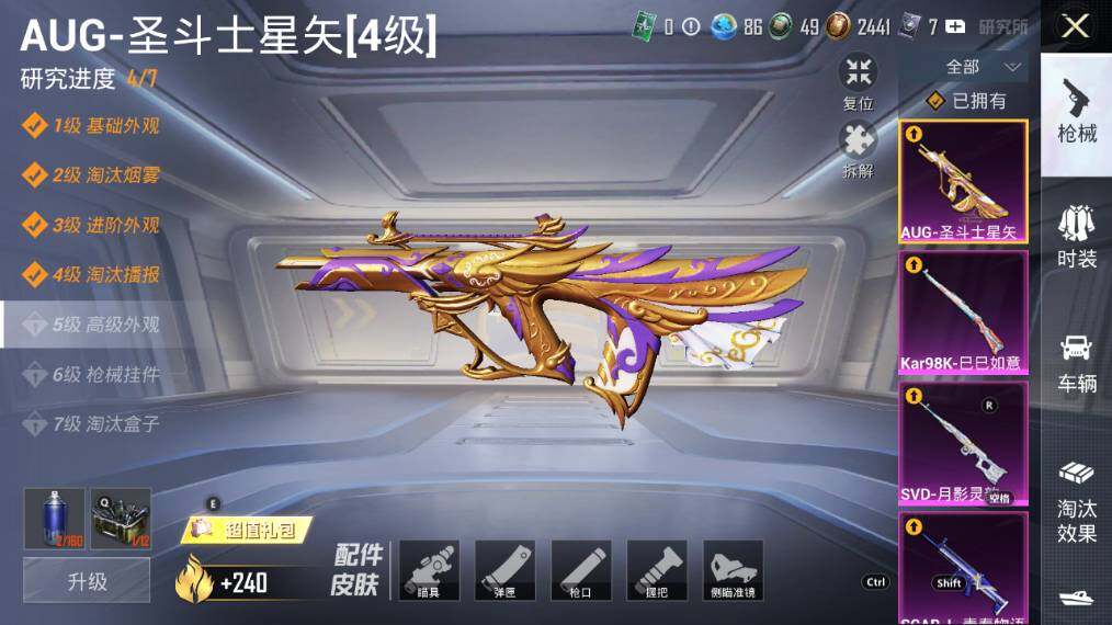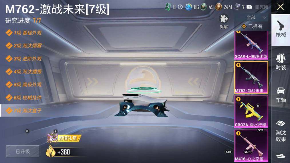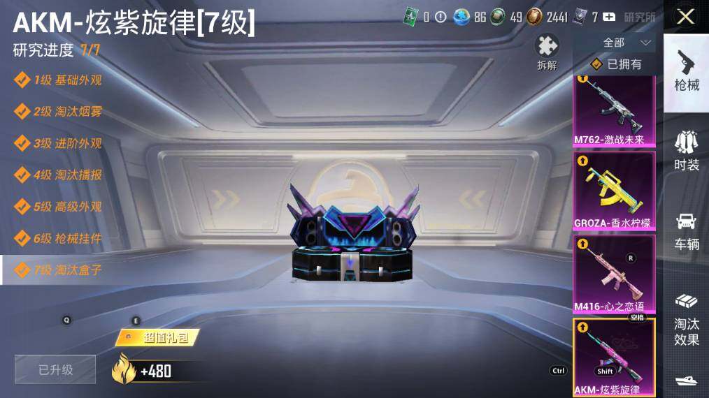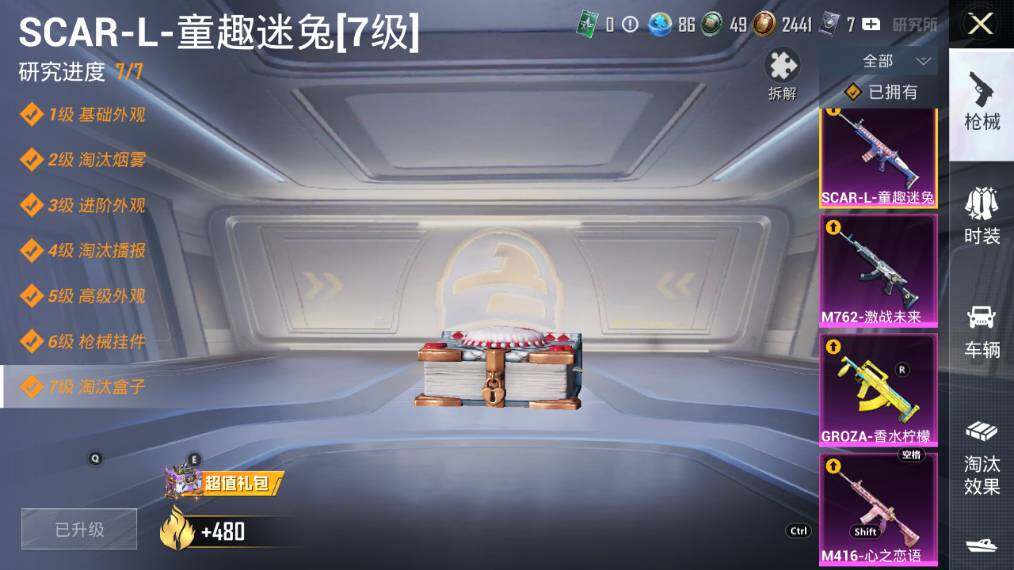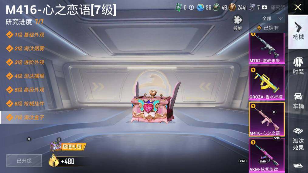 【粉色枪皮等级】:AKM-炫紫旋律(七级),SCAR-L-童趣迷兔(七级),SCAR-L-青春物语(三级),M416-心之恋语(七级),GROZA-香水柠檬(七级),AUG-圣斗士星矢(四级),M762-激战未来(七级),Kar98K-巳巳如意(四级),SVD-月影灵韵(一级)