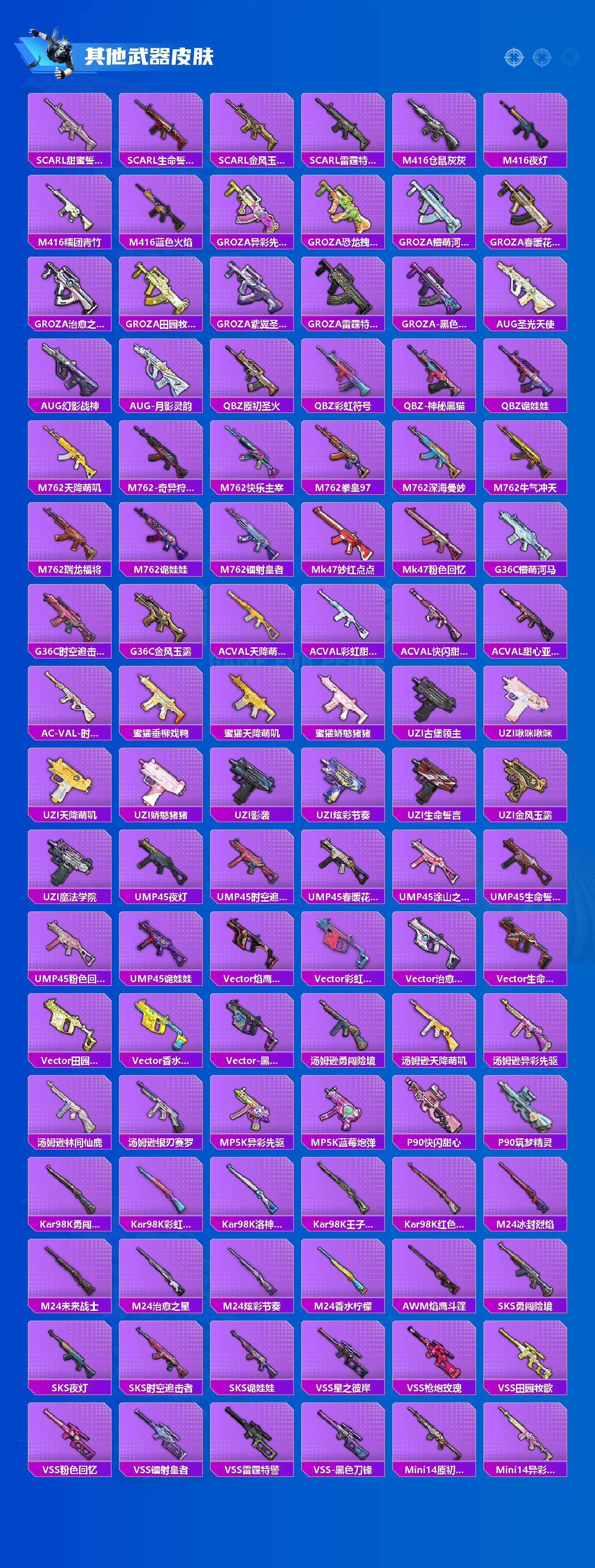 【稀有枪皮】:AKM-夜灯,AKM-恐龙拽拽,AKM-灼热熔岩,AKM-生命誓言,AKM-萌趣颜团子,AKM-虎虎生威,AKM-霓虹街区,M16A4-幻世战舞者,M16A4-甜心亚梦,M16A4-红色方程式,SCAR-L-炫彩节奏,SCAR-L-玉兔迎春,SCAR-L-甜蜜誓约,SCAR-L-生命誓言,SCAR-L-金风玉露,SCAR-L-雷霆特警,M416-仓