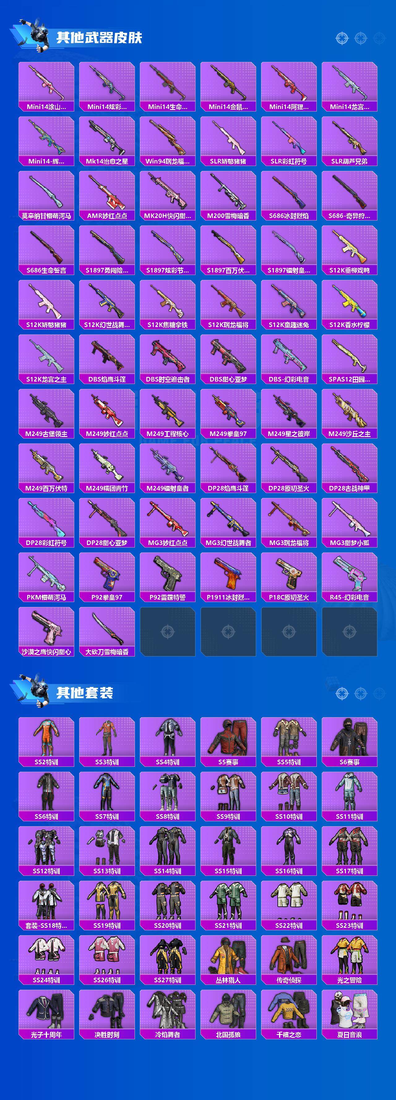 - [11519710]5粉装 6特效枪 可二次 身法装备:Mark.06(新蓝螳螂) 热门装扮:萨利娅,星穹咏叹调,齐天大圣,鸢尾晶梦,守护天翼,呆萌铁蟹 稀有枪皮:AUG-暖羊咩咩,Kar98K-巳巳如意,GROZA-镜光银凌,MK14-甜梦熊击,Mk14-爆裂游戏,DP-28圣堂之誓 六级特效枪:六级DP-28-圣堂之誓 五级特效枪:五级GROZA-镜光银凌,五级Kar98K-巳巳如意,五级MK14-甜梦熊击,五级AUG-暖羊咩咩 四级特效枪:四级Mk14-爆裂游戏 紫色装扮:SS22特训,萌趣咩咩,娇憨猪猪,SS31特训套装,混沌火种,SS33特训套装,顶瓜瓜,荷畔雨呱,耀眼新星,长空猛禽,雨林探路者,冰河战士,龙魂突击队,蝶变,香桃花海,龟仙人,青年教官,龙的传人,麻辣教官,冷焰舞者,王牌教练,SS29特训,Mark.06(新蓝螳螂),纯真浪花,热情海星,SS28特训,卖崽青蛙,创世·幻影,暗影刺翼,燕燕于飞,光矢逐梦,鱼渊荷华,巳巳如意,海琴烟,竞技名士,街头风暴,SS25特训,粉红小猪,格斗专家,星渊小夜曲,大橘大利,SS32特训服(SS32特训套装),恋语绒绒,冰原奔狼,光之冒险 优质战备:精灵梦叶罗丽降落伞,圣堂之誓降落伞,宇宙意志降落伞,繁龙极客降落伞,幻彩电音降落伞,祥瑞起舞飞行器,万象金身飞行器,幻影飞狐降落伞,鬼刀降落伞,金蛇镇世降落伞,彩虹甜喵降落伞,千面幻镜飞行器,垂柳戏鸭降落伞,齐天大圣降落伞,飞行器-天之羽翼