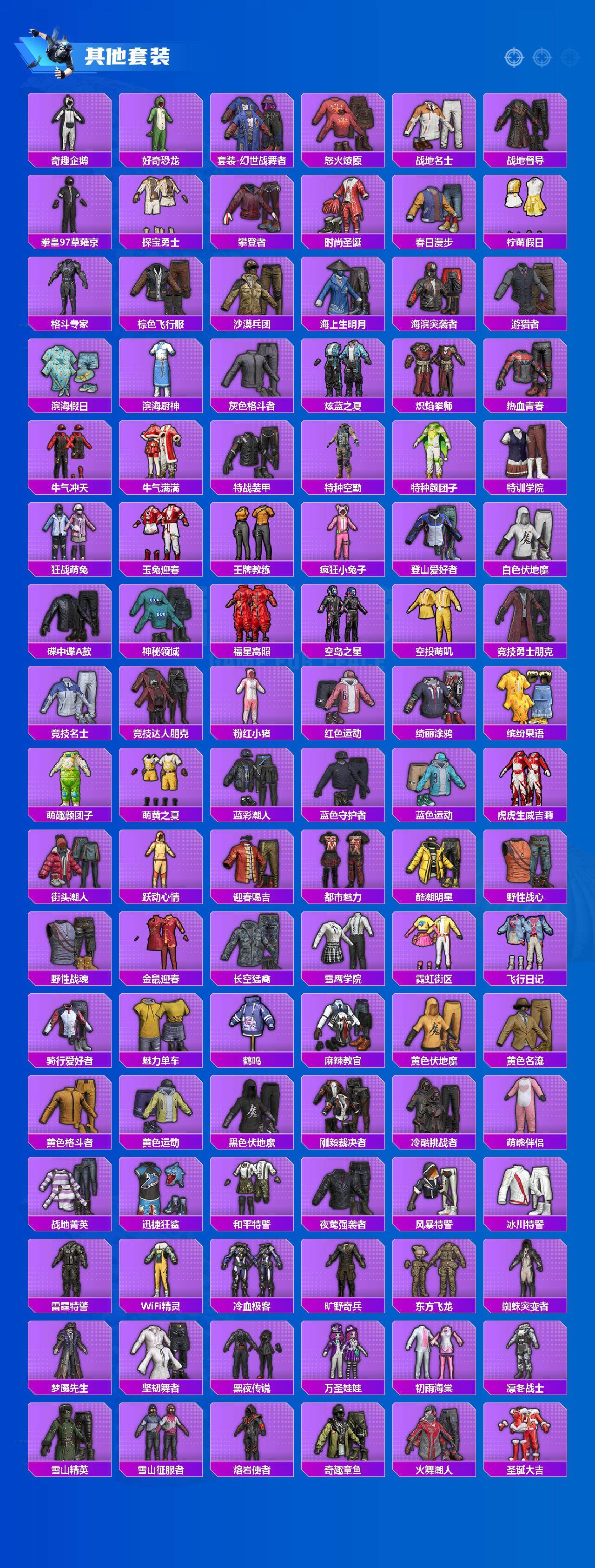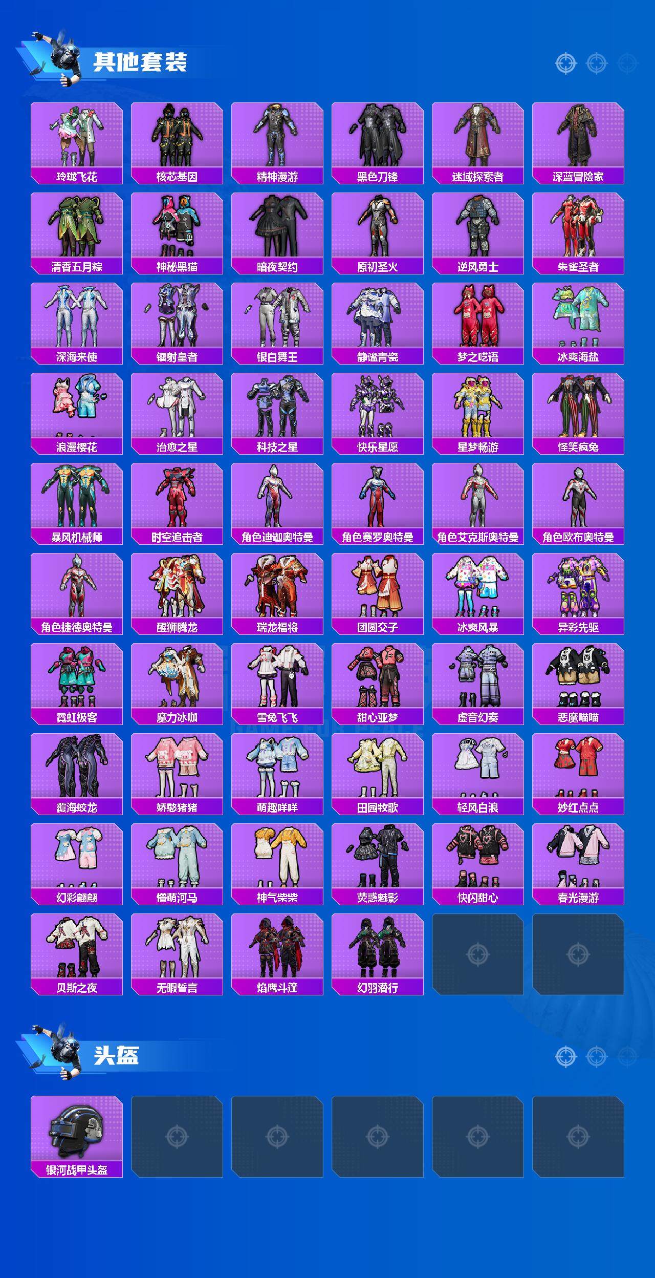 套装-粉红小猪,套装-雪山精英,套装-黑色刀锋,套装-暗夜契约,套装-朱雀圣者,套装-静谧青瓷,套装-梦之呓语,套装-冰爽海盐,套装-怪笑疯兔,角色-迪迦奥特曼,角色-赛罗奥特曼,套装-醒狮腾龙,套装-瑞龙福将,套装-团圆交子