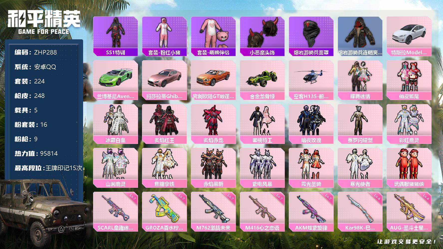 [12949910]【特价!急出!】安卓 手Q-16粉装-9特效枪-5载具-4粉色飞行器-95814热力值-15王牌印记-224套装-248枪皮 【热门品类】:套装-SS1特训,套装-粉红小猪,套装-萌熊伴侣,小恶魔头饰,熔岩游骑兵面罩,熔岩游骑兵连帽夹克 【粉色载具】:特斯拉Model X(珍珠白),兰博基尼Aventador SVJ(翡翠绿),玛莎拉蒂Ghibli(粉),宾利欧陆GT敞篷(火焰橘),合金龙骨(绿),空客H135-蔚蓝之翼 【粉色套装】:粉装-蝶舞迷情,粉装-俏皮狐尾,粉装-冰霜白皇,粉装-炙焰红王,粉装-炙焰赤龙,粉装-蜜桃特工,粉装-暗夜玫瑰,角色-赛罗闪耀型,粉装-彩虹鹿灵,粉装-山涧鹿灵,粉装-焦糖拿铁,粉装-赤焰黑爵,粉装-紫电风暴,粉装-霞光圣骑,粉装-寒光使者,玩偶服-猪猪侠 【粉色枪皮等级】:AKM-炫紫旋律(七级),SCAR-L-童趣迷兔(七级),SCAR-L-青春物语(三级),M416-心之恋语(七级),GROZA-香水柠檬(七级),AUG-圣斗士星矢(四级),M762-激战未来(七级),Kar98K-巳巳如意(四级),SVD-月影灵韵(一级) 【粉色枪皮】:AKM-炫紫旋律,SCAR-L-童趣迷兔,SCAR-L-青春物语,M416-心之恋语,GROZA-香水柠檬,AUG-圣斗士星矢,M762-激战未来,Kar98K-巳巳如意,SVD-月影灵韵 【粉色飞行器】:阿狸红飞行器,风花雪月飞行器,焦糖拿铁飞行器,星际浪客飞行器 【粉色降落伞】:银河战甲降落伞,炫紫旋律降落伞,马卡龙降落伞,诡面斩降落伞,阿狸红降落伞,童趣迷兔降落伞,香水柠檬降落伞,暗夜玫瑰降落伞,林间仙鹿降落伞,洛神天依降落伞,风花雪月降落伞,焦糖拿铁降落伞,恐龙拽拽降落伞,冷魅冰骑降落伞,炙焰牛王降落伞,圣光天使降落伞,妙趣可丽降落伞,翩跹演武降落伞,飒粉甜心降落伞,猪猪侠降落伞,幻彩电音降落伞 【稀有套装】:套装-霓虹热舞 【稀有枪皮】:AKM-夜灯,AKM-恐龙拽拽,AKM-灼热熔岩,AKM-生命誓言,AKM-萌趣颜团子,AKM-虎虎生威,AKM-霓虹街区,M16A4-幻世战舞者,M16A4-甜心亚梦,M16A4-红色方程式,SCAR-L-炫彩节奏,SCAR-L-玉兔迎春,SCAR-L-甜蜜誓约,SCAR-L-生命誓言,SCAR-L-金风玉露,SCAR-L-雷霆特警,M416-仓