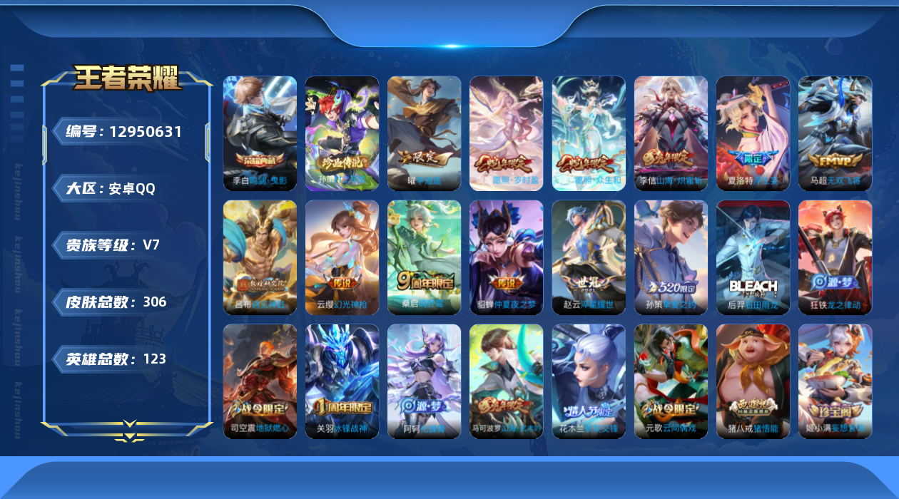 [12950631]【特价急出/详情看图】:安卓Q-V7-最强王者段位-123英雄-306皮肤-1典藏-1珍品传说-12传说-83史诗