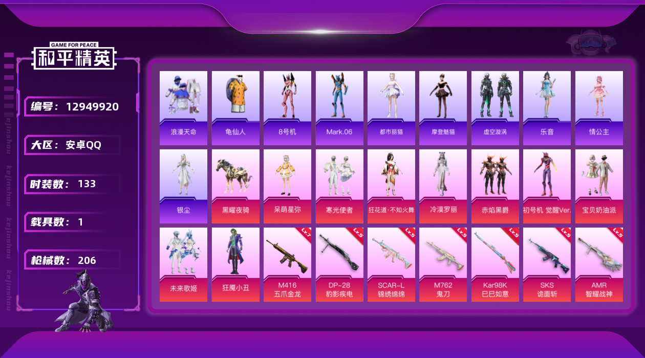 [12949920]素材身法号/地铁满天赋【特价急出/详情看图】:安卓 手Q-9粉装-10特效枪-1载具-8粉色飞行器-6.3w热力值-11王牌印记-133套装-206枪皮【热门品类】:套装-浪漫天命,套装-都市猎人,套装-派对舞王,套装-金羽特工,套装-忍者信条,套装-龟仙人,角色-8号机,角色-Mark.06【粉色载具】:黑曜夜骑【粉色套装】:粉装-宝贝奶油派,粉装-赤焰黑爵,粉装-寒光使者,角色-呆萌星弥,粉装-未来歌姬,角色-初号机 觉醒Ver.,角色-狂花道·不知火舞,角色-狂魇小丑,角色-冷漠罗丽【粉色枪皮等级】:SCAR-L-锦绣绵绵(五级),M416-五爪金龙(七级),M762-鬼刀(五级),UMP45-宇宙意志(三级),Vector-最终圣卫者(三级),Kar98K-巳巳如意(五级),SKS-诡面斩(五级),AMR-智耀战神(五级),DP-28-圣堂之誓(五级),DP-28-豹影疾电(五级)【粉色飞行器】:甜蜜誓约飞行器,镜域双华-灵镜之阶,鎏金朋克飞行器,龙翔九天飞行器,深渊漩涡飞行器,终晖之翼飞行器,灵猫魔法师飞行器
