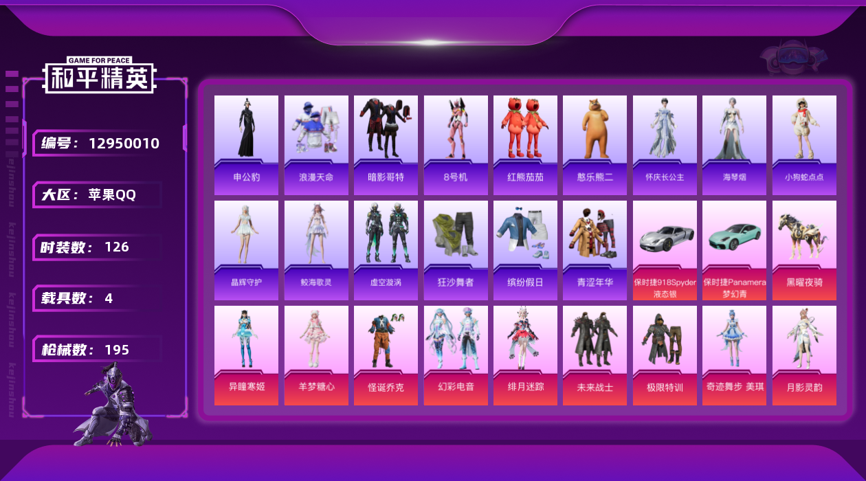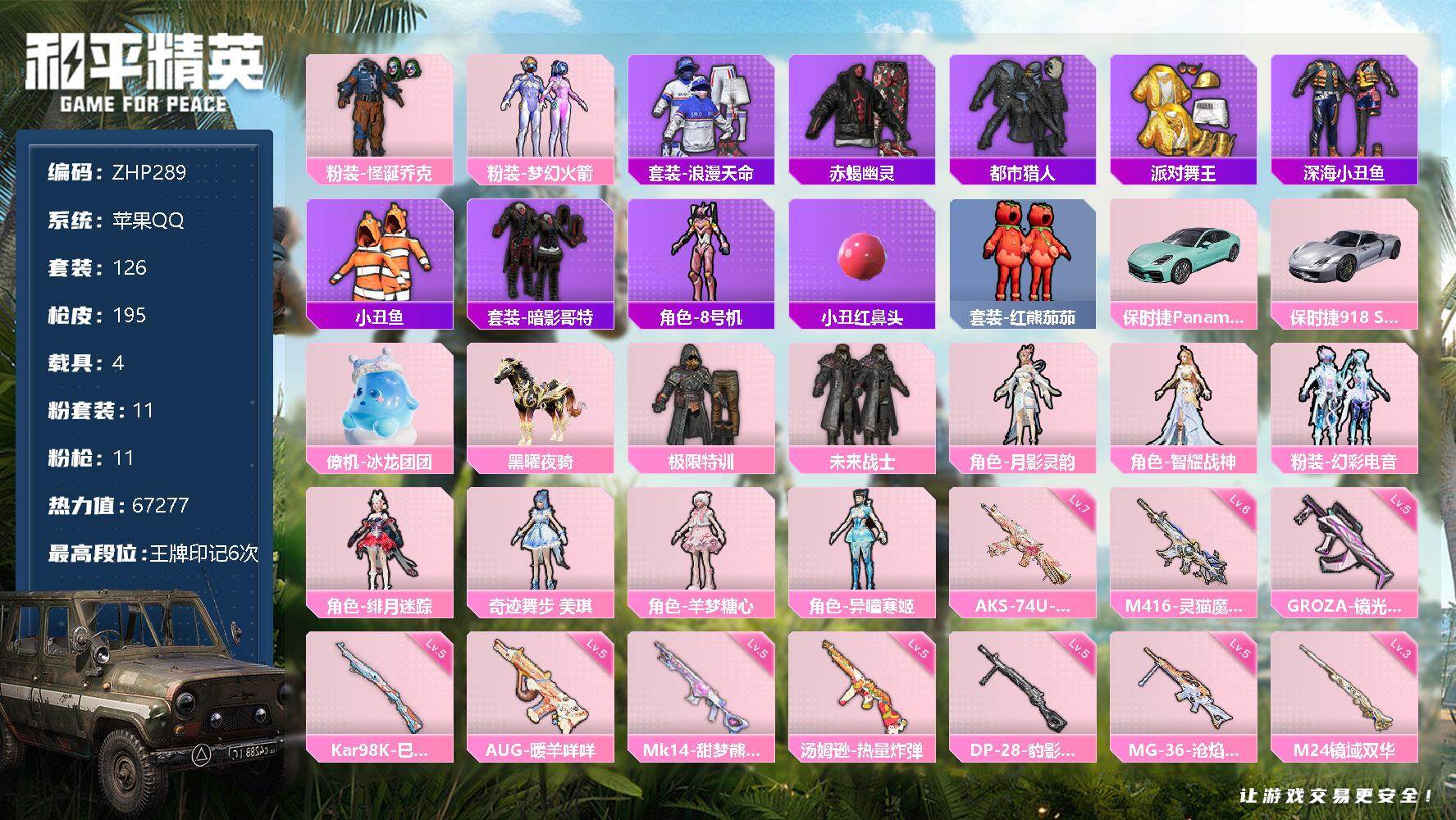 [12950010]素材身法号/绝世印记2/地铁满天赋 苹果 手Q-11粉装-11特效枪-4载具-11粉色飞行器-6.7w热力值-6王牌印记-126套装-195枪皮【热门品类】:粉装-怪诞乔克,粉装-梦幻火箭,套装-浪漫天命,套装-赤蝎幽灵,套装-都市猎人,套装-派对舞王,套装-深海小丑鱼,套装-小丑鱼,套装-暗影哥特,角色-8号机,小丑红鼻头,套装-红熊茄茄【粉色载具】:保时捷Panamera(梦幻青),保时捷918 Spyder(液态银),僚机-冰龙团团,黑曜夜骑【粉色套装】:粉装-极限特训,粉装-未来战士,粉装-怪诞乔克,粉装-梦幻火箭,角色-月影灵韵,角色-智耀战神,粉装-幻彩电音,角色-绯月迷踪,角色-奇迹舞步 美琪,角色-羊梦糖心,角色-异瞳寒姬【粉色枪皮等级】:M416-灵猫魔法师(六级),GROZA-镜光银凌(五级),AUG-暖羊咩咩(五级),汤姆逊-热量炸弹(五级),AKS-74U-星穹咏叹调(七级),P90-魔童闹海 敖丙(三级),Kar98K-巳巳如意(五级),M24-镜域双华(三级),Mk14-甜梦熊击(五级),DP-28-豹影疾电(五级),MG-36-沧焰双生(五级)【粉色飞行器】:酣梦熊熊飞行器,沙丘之主天马,镜域双华-灵镜之阶,龙翔九天飞行器,万象金身飞行器,雀灵庇佑飞行器,灵猫魔法师飞行器,飞天猪飞行器,灵珠游龙飞行器