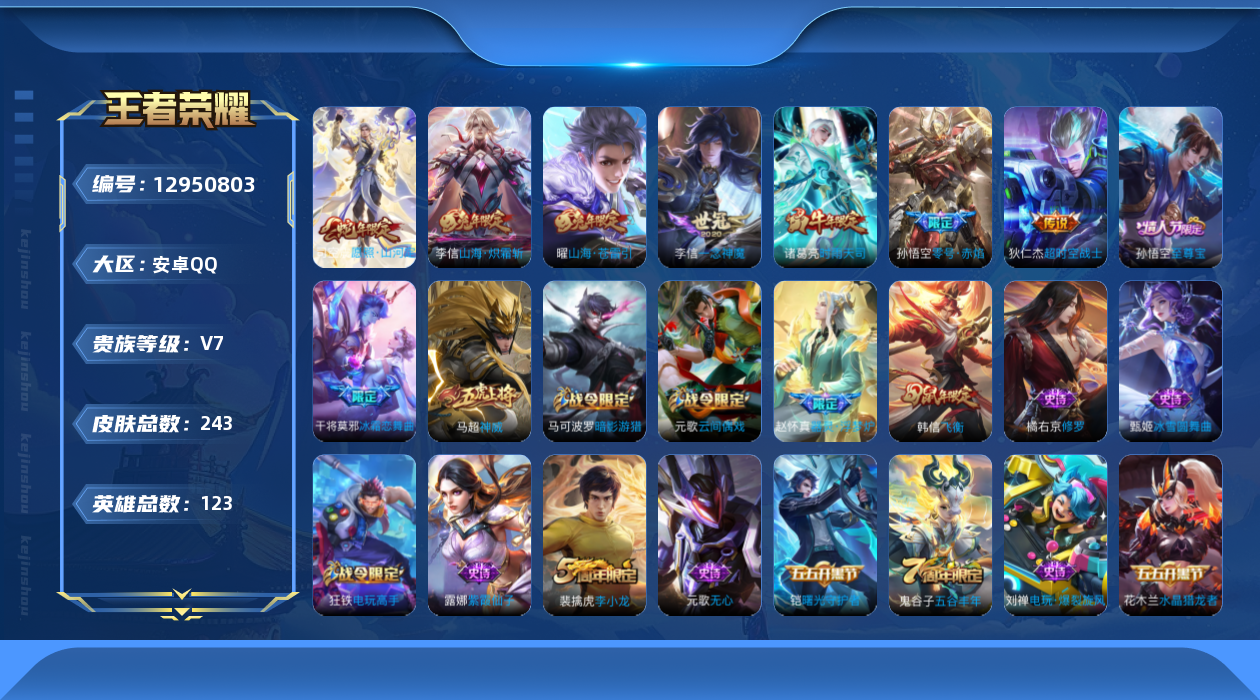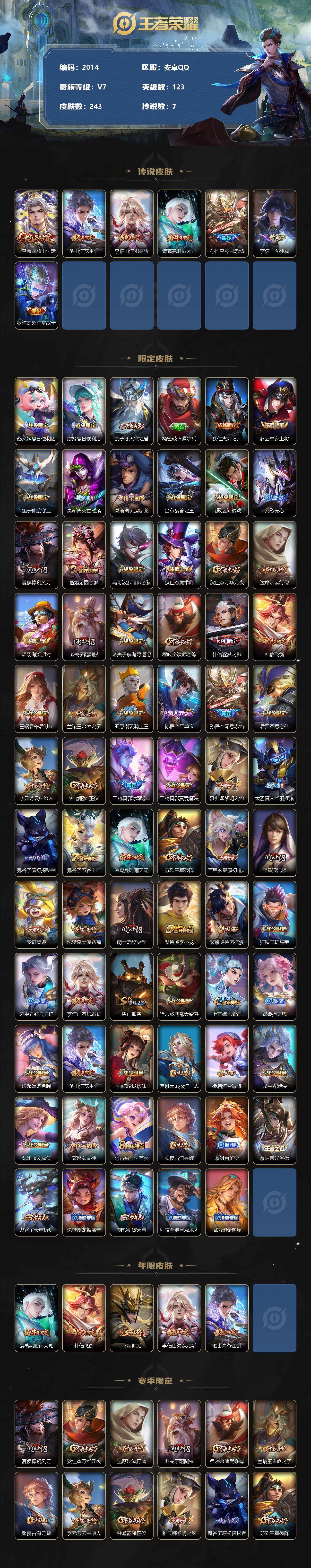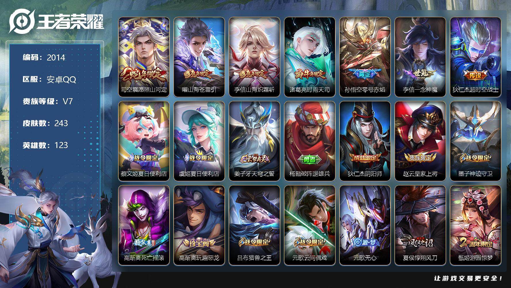 [12950803]安卓Q-V7-永恒钻石V段位-123英雄-243皮肤-0典藏-0珍品无双-0无双-0珍品传说-7传说-62史诗