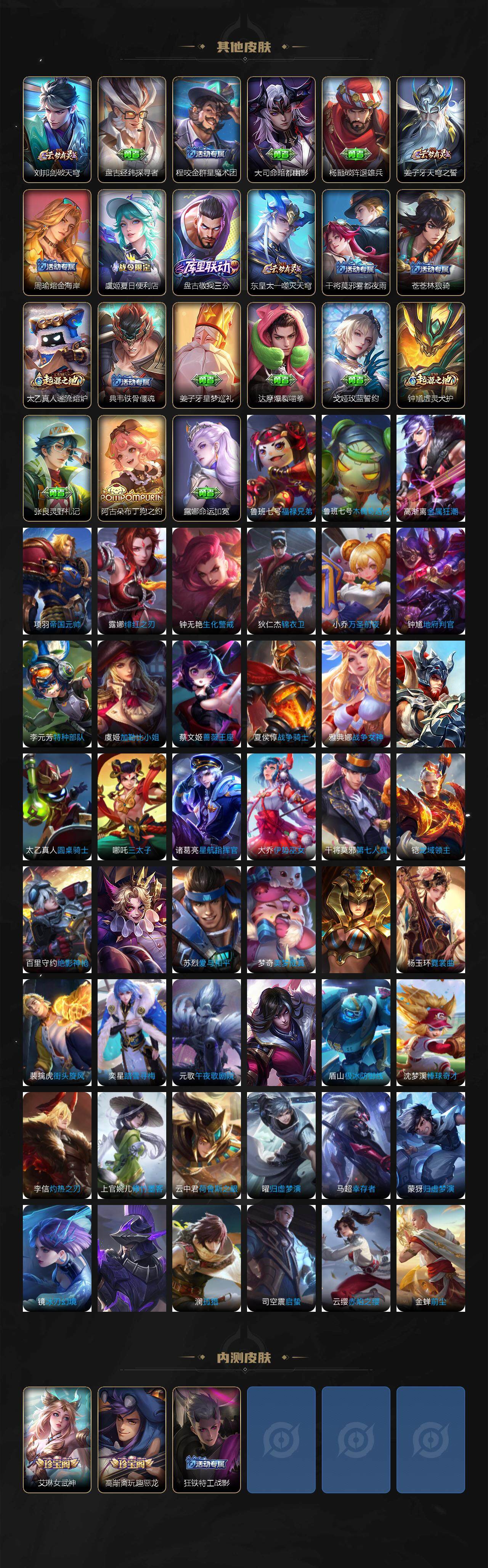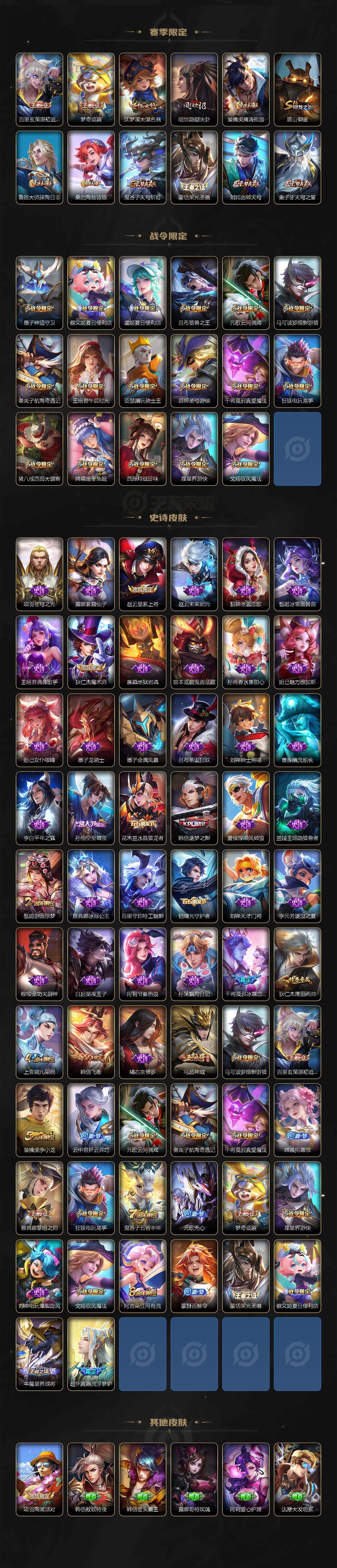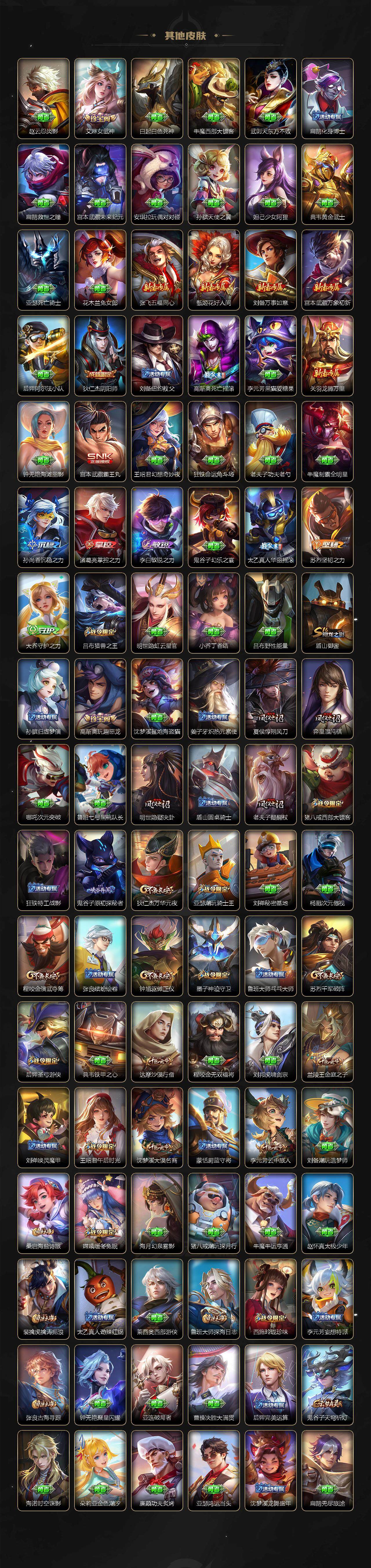 【限定皮肤】:蔡文姬夏日便利店,虞姬夏日便利店,姜子牙天穹之誓,杨戬破阵退雄兵,狄仁杰阴阳师,赵云皇家上将,墨子神迹守卫,高渐离死亡摇滚,高渐离玩趣恶龙,吕布猎兽之王,元歌云间偶戏,元歌无心,夏侯惇朔风刀,甄姬游园惊梦,马可波罗暗影游猎,狄仁杰魔术师,狄仁杰万华元夜,达摩沙漠行僧,项羽海滩派对,老夫子醍醐杖,老夫子航海奇遇记,程咬金演武夺筹,韩信逐梦之影,韩信飞衡,王昭君午后时光,兰陵王金庭之子,亚瑟潮玩骑士王,孙悟空至尊宝,孙悟空零号赤焰,后羿圣弓游侠,李元芳云中旅人,钟馗驱傩正仪,干将莫邪冰霜恋舞曲,干将莫邪真爱魔法,雅典娜黎明之约,太乙真人华丽摇滚,鬼谷子原初探秘者,鬼谷子五谷丰年,诸葛亮时雨天司,苏烈千军破阵,百里玄策原初追逐者,弈星混沌棋,梦奇顽趣,沈梦溪大漠名商,明世隐疑决卦,裴擒虎李小龙,裴擒虎擒涛扼浪,狂铁电玩高手,云中君纤云弄巧,李信山海炽霜斩,盾山御銮,猪八戒西部大镖客,上官婉儿梁祝,嫦娥拒霜思,嫦娥暖冬兔眠,曜山海苍雷引,西施玲珑珍味,鲁班大师探海日志,桑启海盐诗旅,暃星界游侠,戈娅驭风魔法,艾琳女武神,阿古朵江河有灵,张良古海寻踪,蒙犽百解令,蒙恬荣光圣徽,鬼谷子天穹祈灯,沈梦溪龙舞盛年,刘邦剑破天穹,程咬金群星魔术团,周瑜熔金海岸
