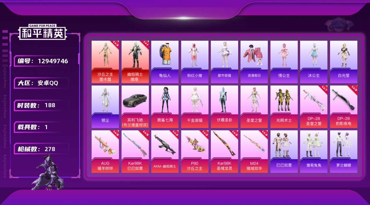 [12949746]1级维塔2级图卡盟!安卓 手Q-2神装-5粉装-8特效枪-1载具-10粉色飞行器-96803热力值-22王牌印记-188套装-278枪皮