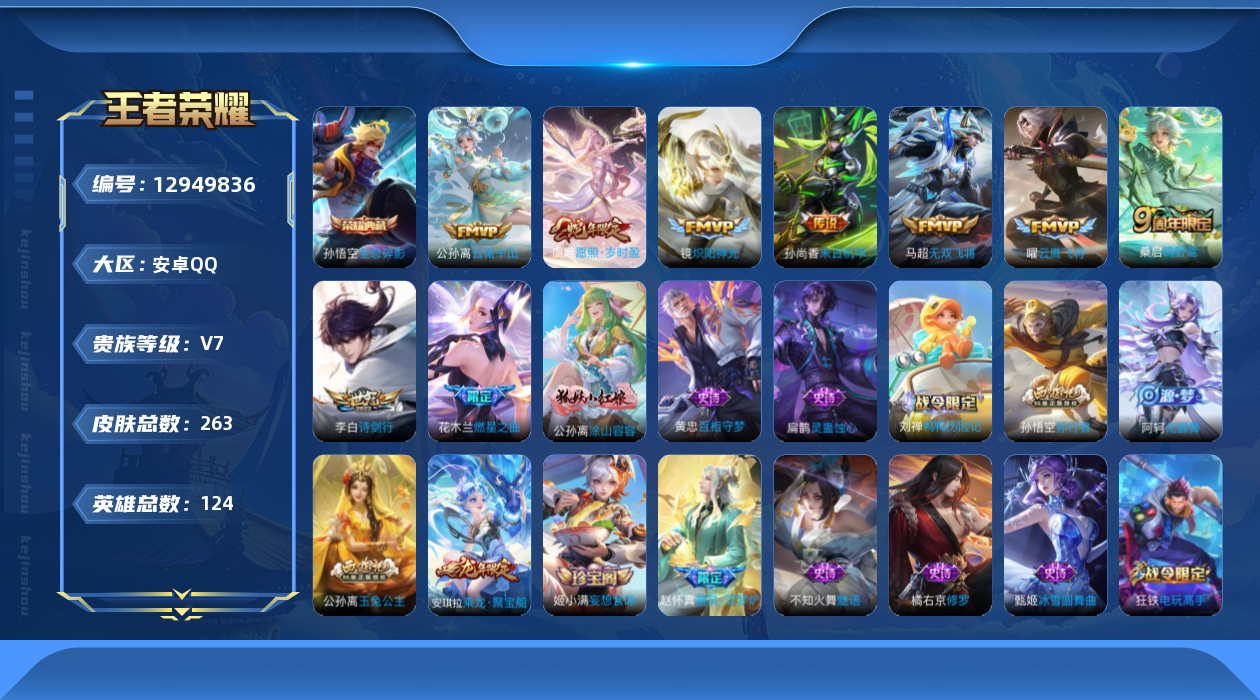 [12949836]安卓Q-V7-最强王者段位-124英雄-263皮肤-1典藏-0珍品无双-0无双-0珍品传说-9传说-75史诗