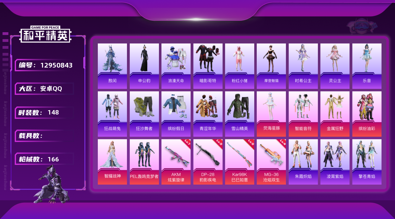 [12950843]地铁满天赋【特价急出/详情看图】:安卓 手Q-7粉装-4特效枪-1粉色飞行器-5w热力值-4王牌印记-148套装-166枪皮【热门品类】:粉装-梦幻火箭,粉装-缤纷油彩,套装-浪漫天命,套装-小丑鱼,套装-奇异狩猎者,套装-潮萌小黄鸭,套装-暗影哥特,套装-浪漫波比,套装-粉红小猪【粉色套装】:粉装-梦幻火箭,粉装-金属狂野,粉装-智能音符,粉装-缤纷油彩,粉装-PEL轰鸣竞梦者,角色-智耀战神,角色-荧海星豚【粉色枪皮等级】:AKM-炫紫旋律(七级),Kar98K-巳巳如意(五级),DP-28-豹影疾电(五级),MG-36-沧焰双生(四级)【粉色飞行器】:梦幻火箭飞行器