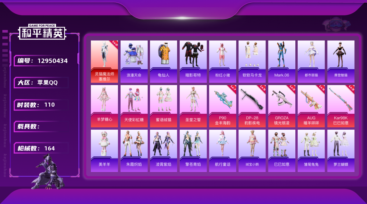 [12950434]素材身法号/地铁满天赋【特价急出/详情看图】:苹果 手Q-1神装-4粉装-6特效枪-4.7w热力值-9王牌印记-110套装-164枪皮【红色神装等级】:灵猫魔法师-塞维尔(二级)【热门品类】:套装-浪漫天命,套装-派对舞王,套装-龟仙人,套装-暗影哥特,套装-粉红小猪,套装-软软马卡龙,角色-Mark.06【粉色套装】:粉装-天使彩虹糖,角色-圣堂之誓,粉装-蜜语绒猫,角色-羊梦糖心【粉色枪皮等级】:GROZA-镜光银凌(五级),AUG-暖羊咩咩(五级),P90-金丰海韵(七级),Kar98K-巳巳如意(五级),Mk14-甜梦熊击(五级),DP-28-豹影疾电(五级)