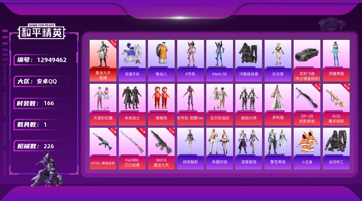 [12949462]素材身法号/绝世印记1 安卓 手Q-1神装-8粉装-5特效枪-1载具-2粉色飞行器-7.3w热力值-12王牌印记-166套装-226枪皮【红色神装等级】:墨龙九天-敖渊(三级)【热门品类】:套装-浪漫天命,套装-都市猎人,套装-深海小丑鱼,套装-小丑鱼,套装-奇异狩猎者,套装-金羽特工,套装-龟仙人,角色-8号机,角色-Mark.06【粉色载具】:宾利飞驰(布罗德盖棕双色)【粉色套装】:粉装-数码大师,粉装-未来战士,粉装-宝贝奶油派,粉装-天使彩虹糖,玩偶服-猪猪侠,角色-初号机 觉醒Ver.,角色-萨利娅,角色-异瞳寒姬【粉色枪皮等级】:M416-墨龙九天(三级),AUG-暖羊咩咩(五级),M762-青锋波束(五级),Kar98K-巳巳如意(五级),DP-28-豹影疾电(五级)【粉色飞行器】:龙翔九天飞行器,深渊漩涡飞行器