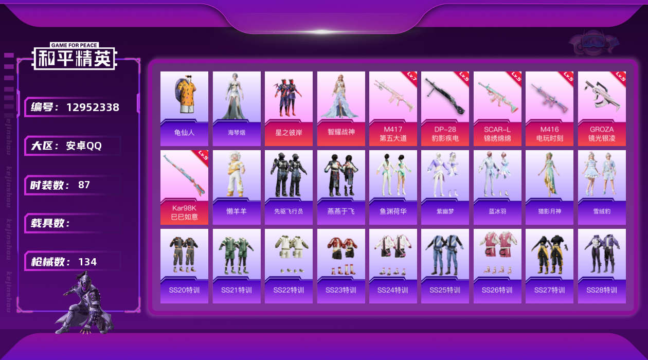 [12952338]【特价急出/详情看图】:安卓 手Q-2粉装-6特效枪-1粉色飞行器-3.6w热力值-13王牌印记-87套装-134枪皮【热门品类】:套装-龟仙人【粉色套装】:粉装-星之彼岸,角色-智耀战神【粉色枪皮等级】:SCAR-L-锦绣绵绵(五级),M416-电玩时刻(五级),GROZA-镜光银凌(五级),Kar98K-巳巳如意(五级),M417-第五大道(七级),DP-28-豹影疾电(五级)【粉色飞行器】:繁龙极客飞行器