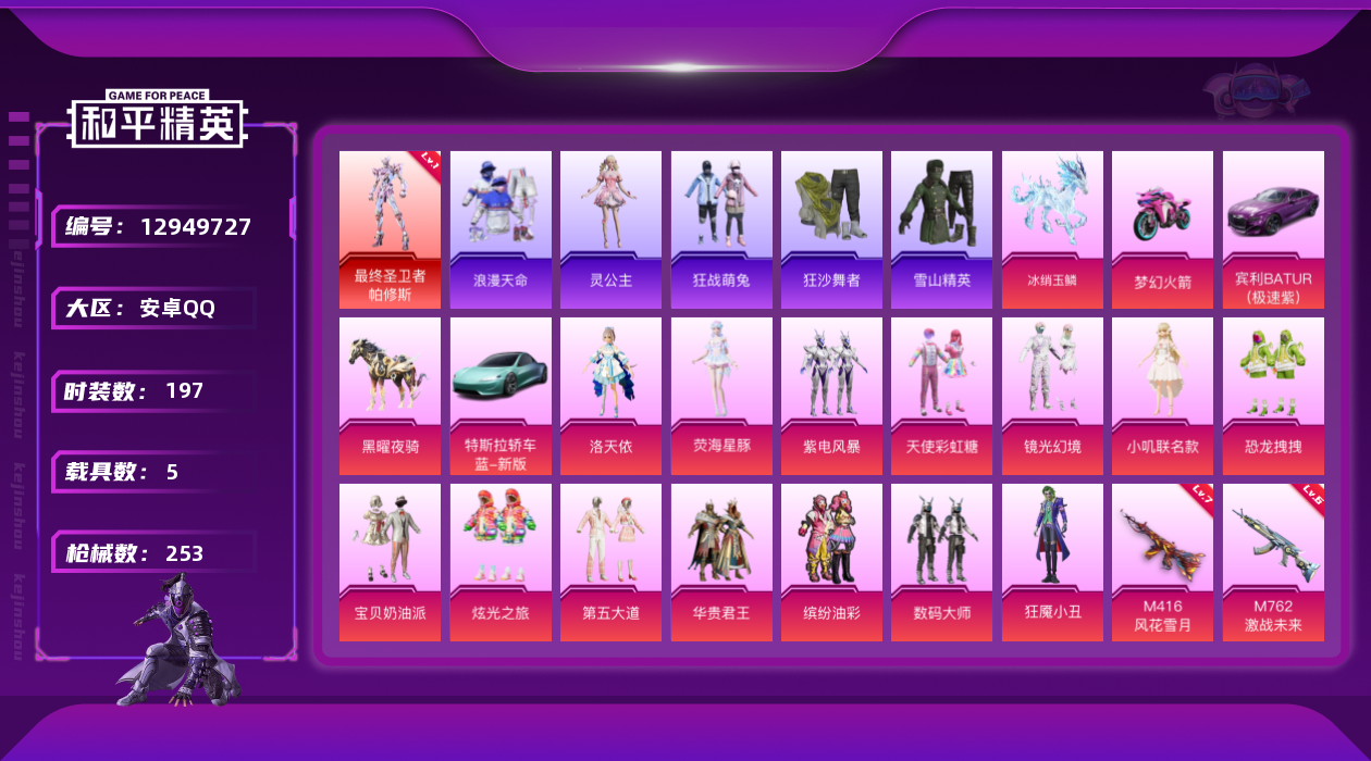 [12949727]素材身法号/老101/绝世印记1【特价急出/详情看图】:安卓 手Q-1神装-15粉装-12特效枪-5载具-6粉色飞行器-9.5w热力值-12王牌印记-197套装-253枪皮【红色神装等级】:最终圣卫者-帕修斯(一级)【热门品类】:粉装-梦幻火箭,粉装-缤纷油彩,套装-浪漫天命,套装-火箭少女101,套装-深海小丑鱼,套装-小丑鱼,套装-潮萌小黄鸭【粉色载具】:特斯拉Roadster(水滴蓝),宾利BATUR(极速紫),双人摩托-梦幻火箭,黑曜夜骑,冰绡玉鳞【粉色套装】:粉装-数码大师,粉装-宝贝奶油派,粉装-天使彩虹糖,粉装-梦幻火箭,粉装-华贵君王,粉装-缤纷油彩,角色-洛天依,粉装-恐龙拽拽,粉装-紫电风暴,粉装-第五大道,粉装-炫光之旅,粉装-镜光幻境,角色-小叽联名款,角色-狂魇小丑,角色-荧海星豚【粉色枪皮等级】:AKM-梦之光华(五级),M416-五爪金龙(四级),M416-风花雪月(七级),M762-激战未来(六级),Vector-最终圣卫者(三级),Kar98K-巳巳如意(五级),AMR-炫光之旅(四级),DP-28-豹影疾电(五级),MG3-洛神天依(五级),MG-36-沧焰双生(四级),烟雾弹-电雾迷城(五级),破片手榴弹-美味星星糖(六级)【粉色飞行器】:梦幻火箭飞行器,镜光幻境飞行翼,终晖之翼飞行器,灵猫魔法师飞行器,飞天猪飞行器