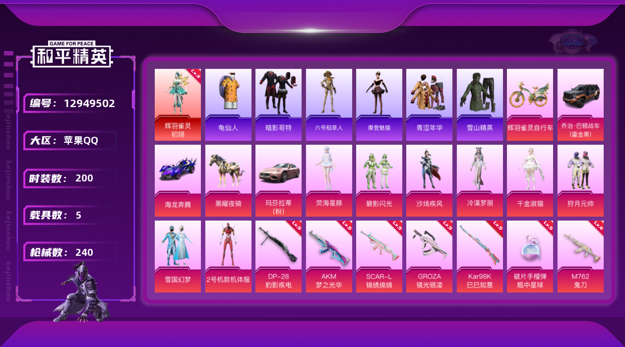 - PX_2096126- 苹果手Q-7王牌印记-2粉装-5特效枪-3载具-63429热力值-128套装-195枪皮-1卓越印记-0传奇印记 【2粉装】,星穹咏叹调,暗夜玫瑰 【5特效枪】M416-电玩时刻-5级 AUG-暖羊咩咩-5级 Kar98K-巳巳如意-5级 Mk14-甜梦熊击-5级 SLR-暗夜玫瑰-5级 【2稀有紫装】,雪山精英,龟仙人, 【3稀有载具】,兰博基尼Estoque(银翼灰)