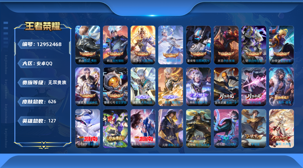 [12952468]对抗路41段/打野36段【特价急出/详情看图】:安卓Q-V11-至尊星耀V段位-127英雄-626皮肤-10典藏-3无双-6珍品传说-99传说-215史诗 【荣耀典藏】:武则天英雄,孙悟空全息碎影,夏侯惇无限飓风号,鲁班七号星空梦想,李白鸣剑曳影,诸葛亮星域神启,花木兰九霄神辉,关羽赤影疾锋,铠银白咏叹调,韩信弑枪猎影,伽罗最初的交响 【无双皮肤】:韩信群星魔术团,曜器灵螭龙剑,诸葛亮天机白泽 【珍品传说】:马可波罗怪盗基德,鲁班七号江户川柯南,孙策时之奇旅,张飞兔狲蓬尾,暃朽木白哉,宫本武藏黑崎一护 【传说皮肤】:干将莫邪千山共赴,元歌诡秘之主,大司命死亡执政官,司马懿九山相柳,杨玉环星之鸣奏,后羿千劫归真,司空震愿照山河定,女娲愿照千秋盛,妲己愿照众生和,澜愿照九州拓,蔡文姬愿照福禄聚,虞姬愿照岁时盈,云缨幻光神枪,裴擒虎祥瑞亨通,嬴政玄雷天君,桑启鸣野蒿,庄周牧神诗旅,夏侯惇霜北刀,铠冥王哈迪斯,云中君群星魔术团,墨子黄金天蝎座,亚连落雪白狼,吕布曦玄引,典韦战鼓燎原,赵云乘龙铭钟鼎,澜逐花归海,艾琳觅芳踪,狄仁杰夜礼服假面,鲁班七号时之奇旅,兰陵王影龙天霄,吕布遇见神鼓,宫本武藏惊梅引,上官婉儿妄想奇谈,马可波罗妄想实况,东皇太一灼幽烈阳,诸葛亮鹤羽星尊,澜电玩雷克斯,亚瑟追逃游戏,张飞百相守梦,公孙离记忆之芯,夏洛特浮生妄,干将莫邪画中仙,花木兰燃星之曲,虞姬无限倾心,项羽无限倾心,伽罗炽翼辉光,孙悟空齐天大圣,小乔山海琳琅生,曜山海苍雷引,李信山海炽霜斩,吕布怒海麟威,李白诗剑行,狄仁杰神器狴犴令,不知火舞绯月行,百里守约碎云,橘右京枫霜尽,娜可露露前尘镜,孙尚香音你闪耀,马可波罗深海之息,后羿无尽星芒,马超无双飞将,孙策挚爱之约,蔡文姬花朝如约,孙策末日机甲,裴擒虎寅虎赤拳,鲁班七号寅虎瑞焰,孙尚香异界灵契,赵云淬星耀世,王昭君乞巧织情,曜李逍遥 ,周瑜音你心动,小乔音你心动,李元芳飞鸢探春,兰陵王默契交锋,诸葛亮时雨天司,铠绛天战甲,镜炽阳神光,虞姬启明星使,孙悟空零号赤焰,关羽武圣,曜云鹰飞将,李信一念神魔,刘备时之恋人,貂蝉猫影幻舞,张良黄金白羊座,干将莫邪久胜战神,虞姬云霓雀翎,达摩黄金狮子座,花木兰冠军飞将,梦奇胖达荣荣,后羿黄金射手座,杨戬永曜之星,李白凤求凰,孙尚香末日机甲,宫本武藏地狱之眼,孙悟空地狱火,吕布天魔缭乱,武则天海洋之心,