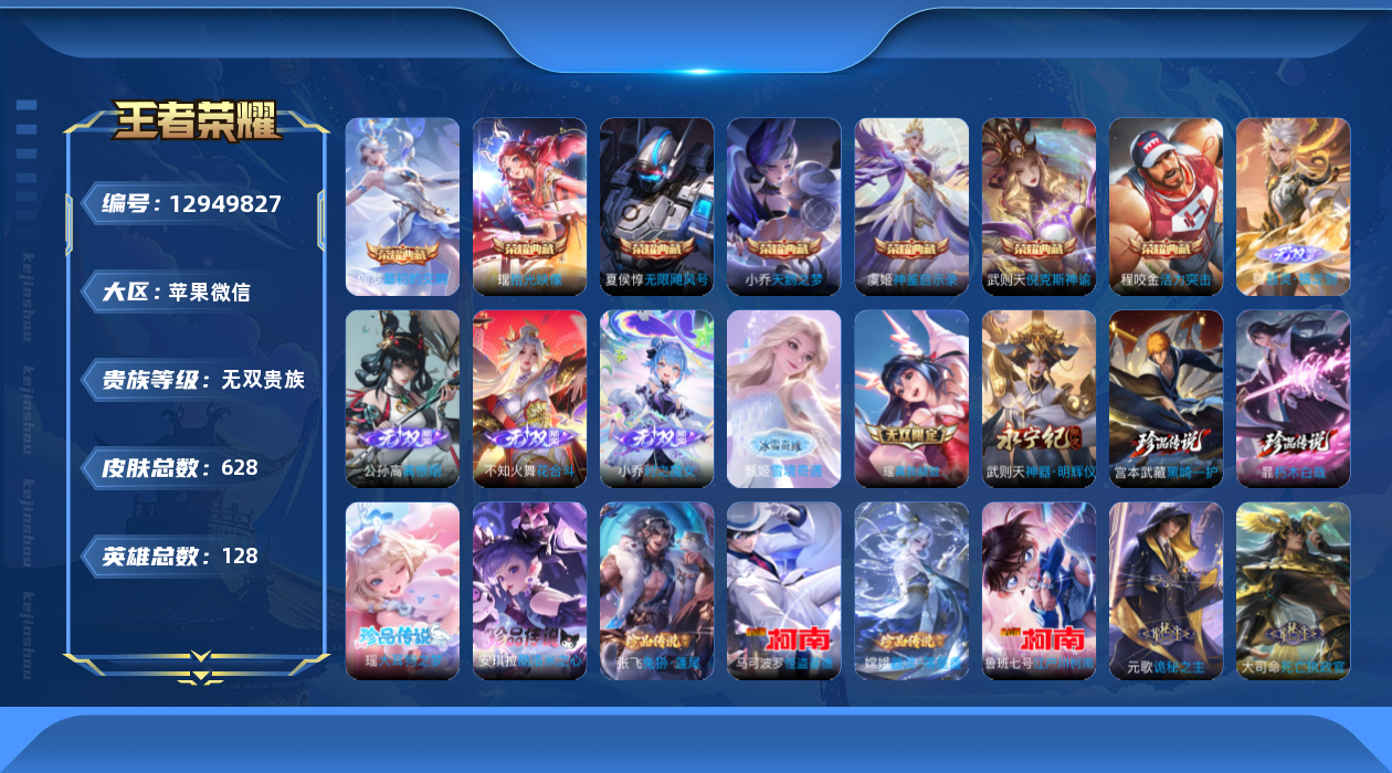 [12949827]苹果WX-V11-最强王者段位-128英雄-628皮肤-7典藏-0珍品无双-7无双-8珍品传说-112传说-221史诗