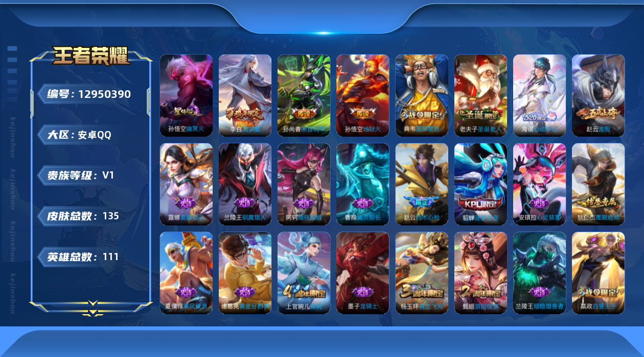 [12950390]【特价急出/详情看图】:安卓Q-V0-荣耀黄金IV段位-109英雄-135皮肤-1星元-3传说-32史诗