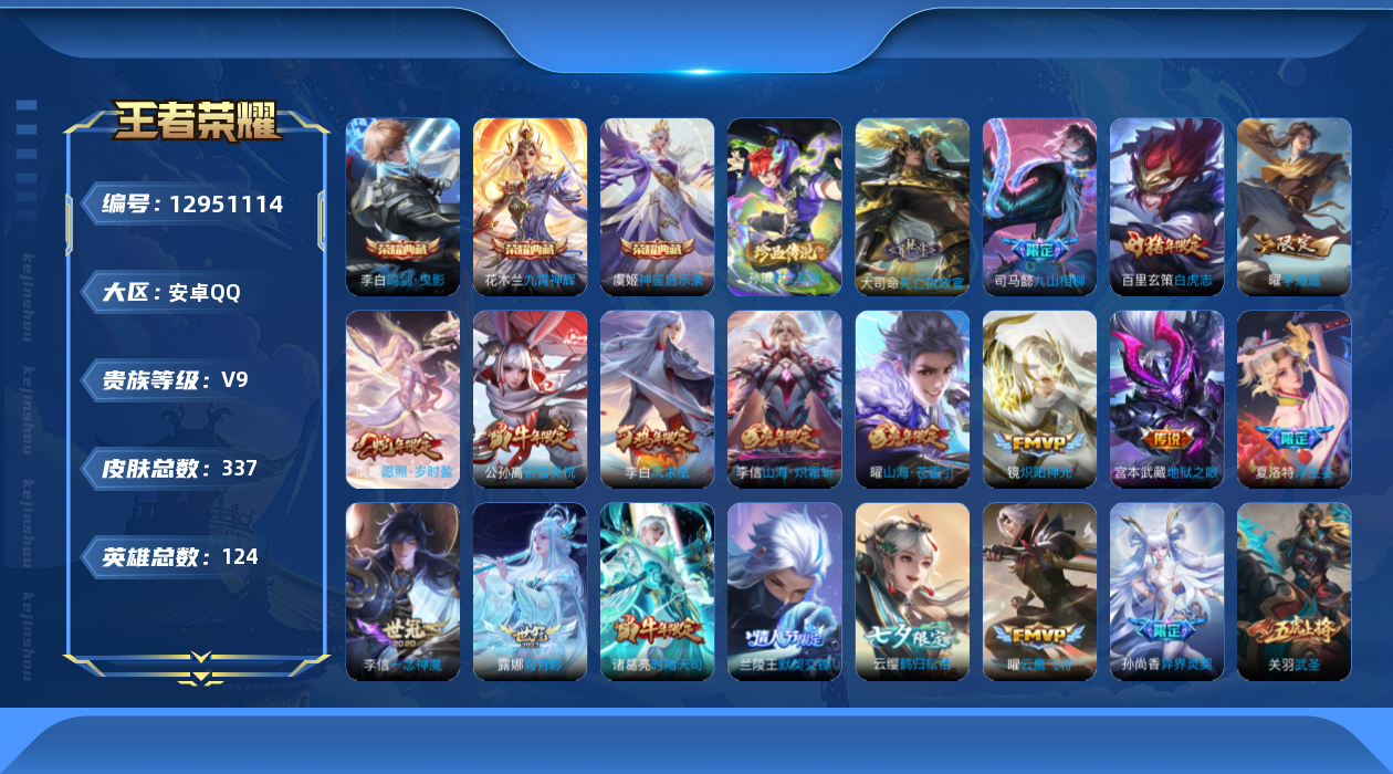 [12951114]【特价急出/详情看图】:安卓Q-V9-至尊星耀IV段位-124英雄-337皮肤-3典藏-1珍品传说-40传说-96史诗 【荣耀典藏】:李白鸣剑曳影,花木兰九霄神辉,虞姬神鉴启示录 【珍品传说】:孙策时之奇旅 【传说皮肤】:大司命死亡执政官,司马懿九山相柳,虞姬愿照岁时盈,云缨幻光神枪,露娜霜月吟,云缨鹤归松栖,夏洛特浮生妄,花木兰燃星之曲,虞姬无限倾心,伽罗炽翼辉光,小乔山海琳琅生,曜山海苍雷引,李信山海炽霜斩,吕布怒海麟威,孙尚香异界灵契,赵云淬星耀世,王昭君乞巧织情,西施游龙清影,曜李逍遥 ,兰陵王默契交锋,公孙离祈雪灵祝,诸葛亮时雨天司,铠绛天战甲,镜炽阳神光,虞姬启明星使,孙悟空零号赤焰,关羽武圣,曜云鹰飞将,李信一念神魔,刘备时之恋人,貂蝉猫影幻舞,干将莫邪久胜战神,虞姬云霓雀翎,百里玄策白虎志,花木兰冠军飞将,后羿黄金射手座,貂蝉仲夏夜之梦,李白凤求凰,宫本武藏地狱之眼,孙悟空地狱火 【限定皮肤】:白起狰,大乔绒语心约,狄仁杰阴阳师,虞姬凯尔特女王,小乔山海琳琅生,赵云皇家上将,墨子神迹守卫,妲己时之彼端,嬴政优雅恋人,嬴政白昼王子,孙尚香异界灵契,鲁班七号狮舞东方,庄周蜃楼王,庄周高山流水,高渐离玩趣恶龙,阿轲迷踪丽影,孙膑妖精王,扁鹊炼金王,芈月白晶晶,吕布猎兽之王,周瑜赤莲之焰,元歌云间偶戏,元歌无心,夏侯惇朔风刀,甄姬游园惊梦,曹操烛龙,典韦穷奇,典韦蓝屏警告,马可波罗暗影游猎,马可波罗山海玄木吟,狄仁杰魔术师,狄仁杰万华元夜,达摩星际陆战队,达摩沙漠行僧,项羽海滩派对,老夫子醍醐杖,老夫子航海奇遇记,关羽冰锋战神,关羽武圣,貂蝉逐梦之音,程咬金演武夺筹,刘邦夺宝奇兵,韩信飞衡,韩信傲雪梅枪,兰陵王默契交锋,兰陵王驯魔猎人,兰陵王金庭之子,花木兰青春决赛季,花木兰瑞麟志,花木兰默契交锋,花木兰燃星之曲,亚瑟潮玩骑士王,孙悟空至尊宝,孙悟空大圣娶亲,孙悟空零号赤焰,孙悟空孙行者,牛魔御旌,后羿圣弓游侠,李元芳银河之约,李元芳云中旅人,虞姬霸王别姬,虞姬启明星使,虞姬无限倾心,钟馗神迹守卫,钟馗驱傩正仪,杨玉环遇见飞天,女娲朔望之晖,干将莫邪真爱魔法,雅典娜单词大作战,雅典娜黎明之约,蔡文姬繁星吟游,太乙真人饕餮,鬼谷子原初探秘者,鬼谷子五谷丰年,诸葛亮时雨天司,大乔白鹤梁神女,铠青龙志,苏烈千军破阵,百里玄策白虎志,百里玄策原初追逐者,百里守约朱