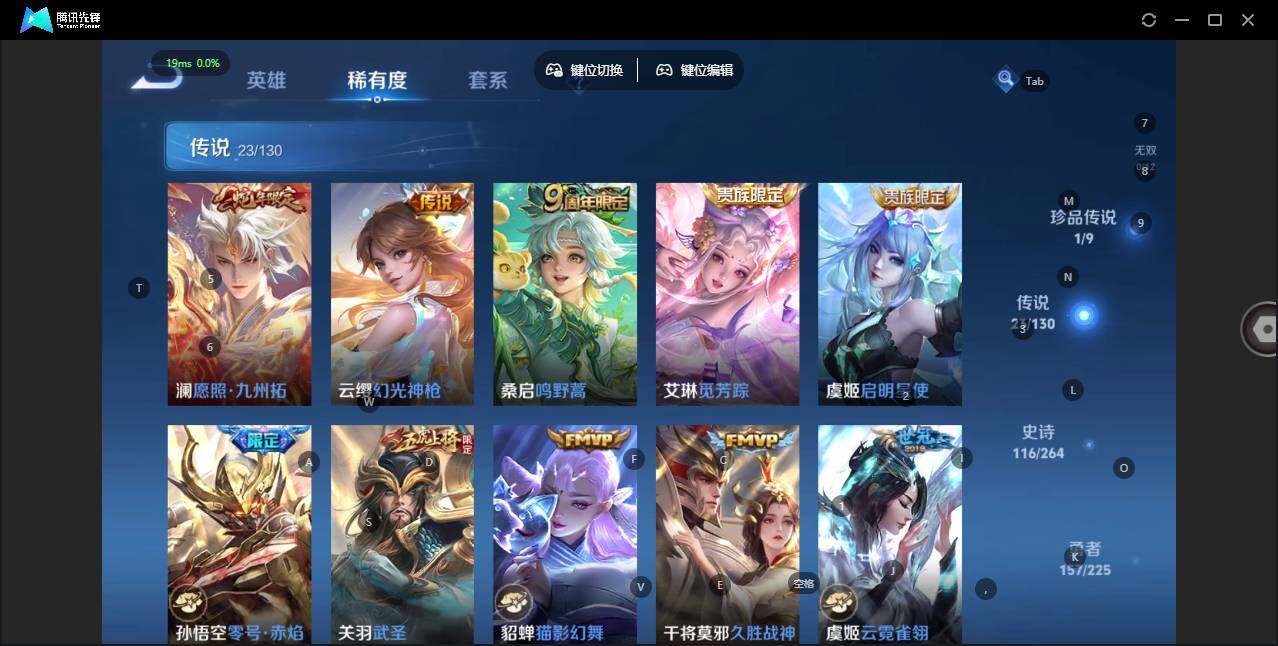 - [12148658]V6 1珍品传说 4传说 72英雄 71皮肤 可修改实名 优质装备:怪盗基德,云鹰飞将(小将军),炽阳神光,霜月吟,涂山容容 传说皮:祥瑞亨通 限定皮:大圣娶亲 史诗皮:化蝶舞,茶境仙,百相守梦-黄忠,遇见神鹿,黄金分割率,偶像歌手,节奏热浪,水果甜心,绅士熊喵,鬼剑武藏,心灵战警,原初追逐者,鹰眼统帅,魅力维加斯