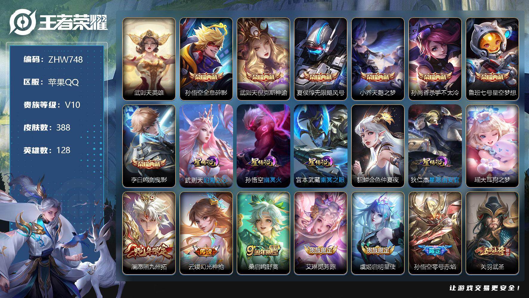 [12950246]苹果Q-V10-最强王者段位-128英雄-388皮肤-8典藏-0珍品无双-0无双-1珍品传说-23传说-116史诗
