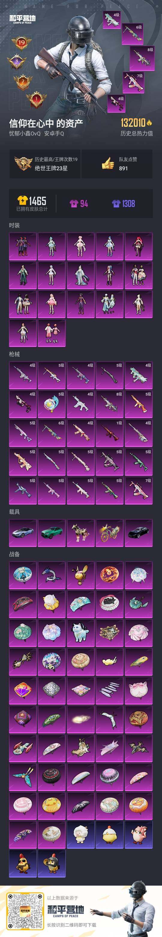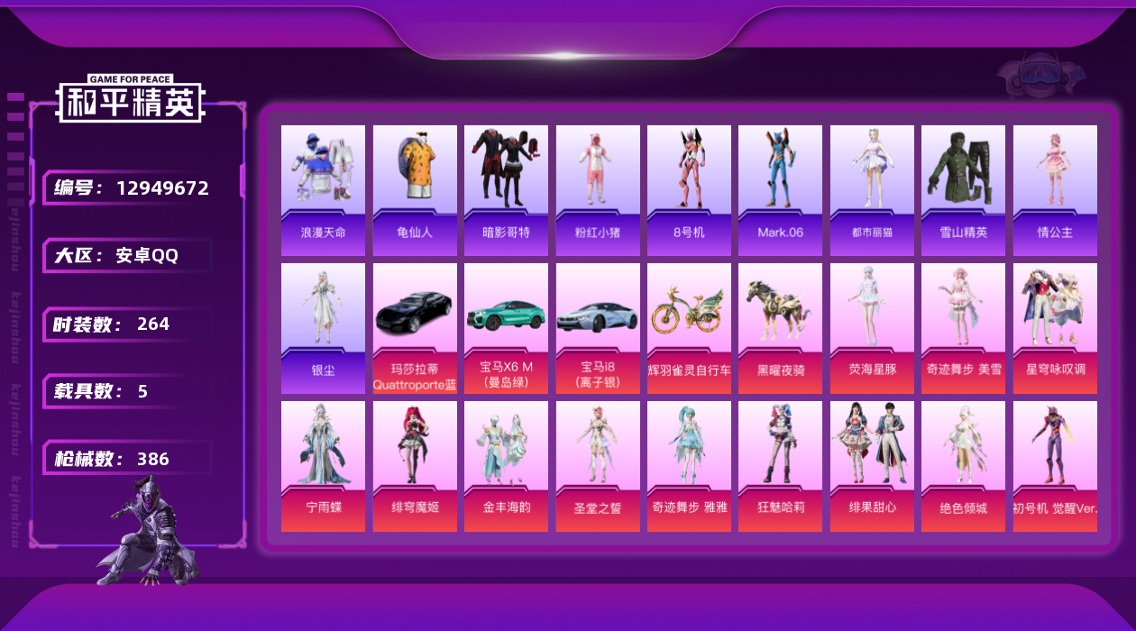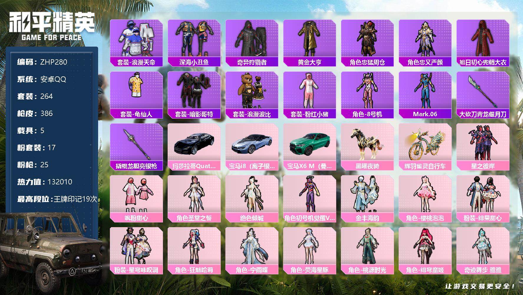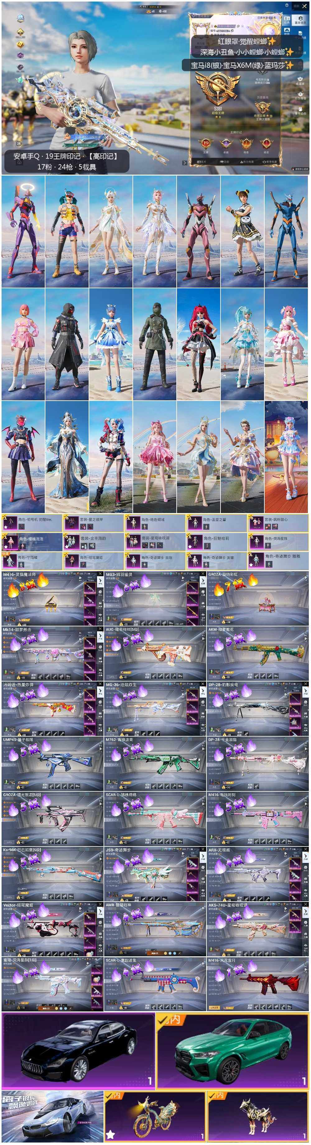 - [12090240]4粉装 9特效枪 2载具 4印记 可二次 可修改实名 身法装备:初号机 觉醒Ver.(新紫螳螂),8号机(新粉螳螂),Mark.06(新蓝螳螂) 优质装备:阿斯顿·马丁DBS(红),路特斯ELETRE(冰川蓝),香水柠檬,Groza香水柠檬,P90-电糖天使,M416墨龙九天,六级M416-墨龙九天,AMR鸢尾晶梦,M200梦海之灵,UMP45量子极限,M762-青锋波束,Kar98K-巳巳如意 热门装扮:齐天大圣,星空武士,初号机 觉醒Ver.(新紫螳螂),迅捷狂鲨,呆萌铁蟹 稀有枪皮:DP-28-豹影疾电 六级特效枪:六级GROZA-香水柠檬 五级特效枪:五级M762-青锋波束,五级UMP45-量子极限,五级AMR-鸢尾晶梦 四级特效枪:四级Kar98K-巳巳如意 三级特效枪:三级P90-电糖天使,三级M200-梦海之灵,三级DP-28-豹影疾电 紫色装扮:SS31特训套装,旭日情侣,SS30特训套装,SS33特训套装,顶瓜瓜,冰爽海盐,浪漫樱花,军刀雅典娜,长空猛禽,雪山精英,蜜露汐语,魅力单车,龟仙人,冰河战士,龙魂突击队,蝶变,香桃花海,暗金炫舞,猛禽,小熊娃娃,雏菊兔兔,萝兰蝴蝶,SS29特训,极冰使者,星途旅人,纯真浪花,热情海星,曼妙人鱼,卖崽青蛙,铁血战翼,8号机(新粉螳螂),Mark.06(新蓝螳螂),冰公主,异域银装,竞技名士,粉红小猪,焰鹰斗篷,幻羽潜行,大橘大利,SS32特训服(SS32特训套装),绯格组合,光之冒险 优质战备:鸢尾晶梦降落伞,霓虹漫游降落伞,绮梦流光降落伞,墨龙九天降落伞,龙翔九天飞行器,精灵梦叶罗丽降落伞,初号机 觉醒Ver.降落伞,星途旅人降落伞,深渊漩涡飞行器,江南烟雨降落伞,香水柠檬降落伞