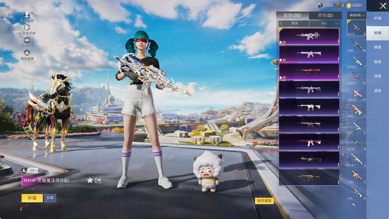AKM-绿萝繁花,SCAR-L-童趣迷兔,M416-风花雪月,M416-电玩时刻,GROZA-旋转彩虹,GROZA-镜光银凌,AUG-暖羊咩咩,M762-青锋波束,UMP45-量子极限,Kar98K-巳巳如意,DP-28-千金淑猫