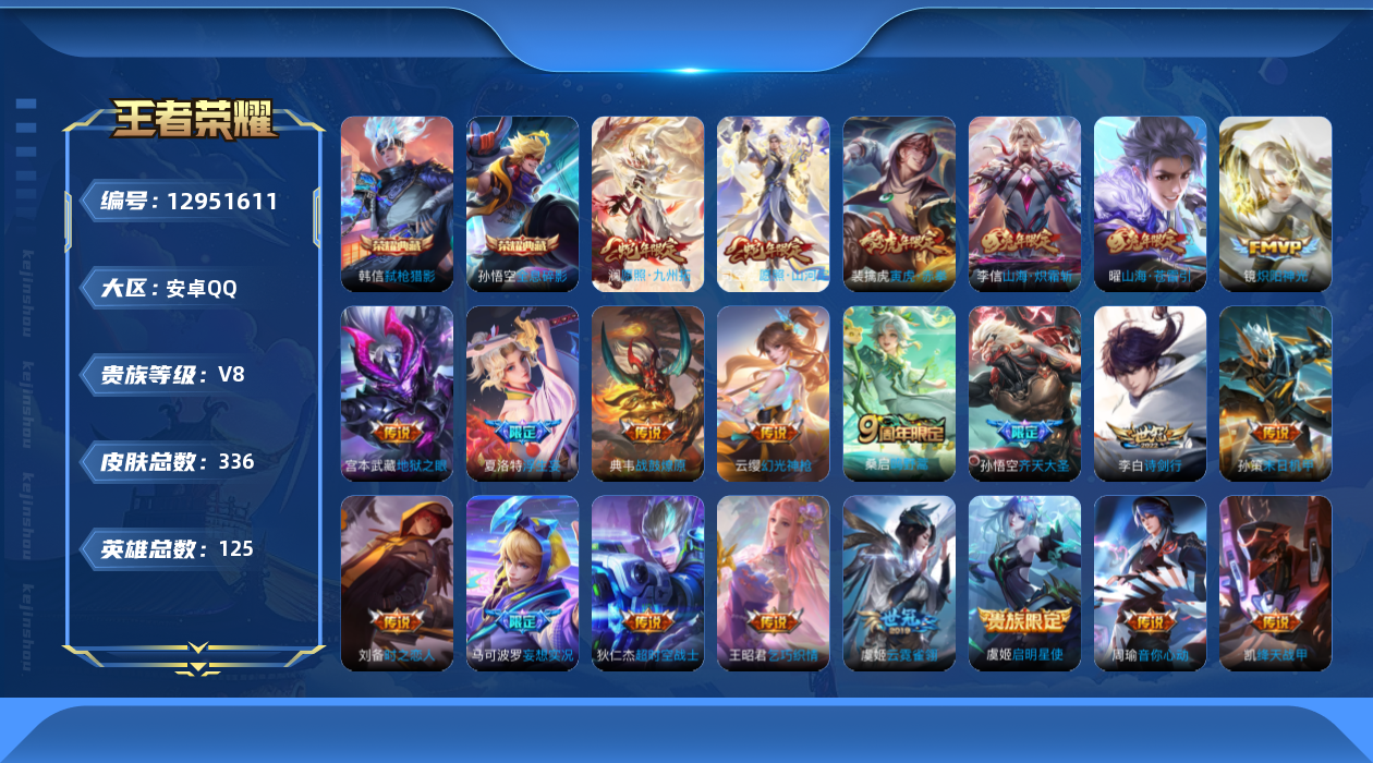 [12951611]打野52段【特价急出/详情看图】:安卓Q-V8-永恒钻石I段位-125英雄-336皮肤-2典藏-22传说-84史诗