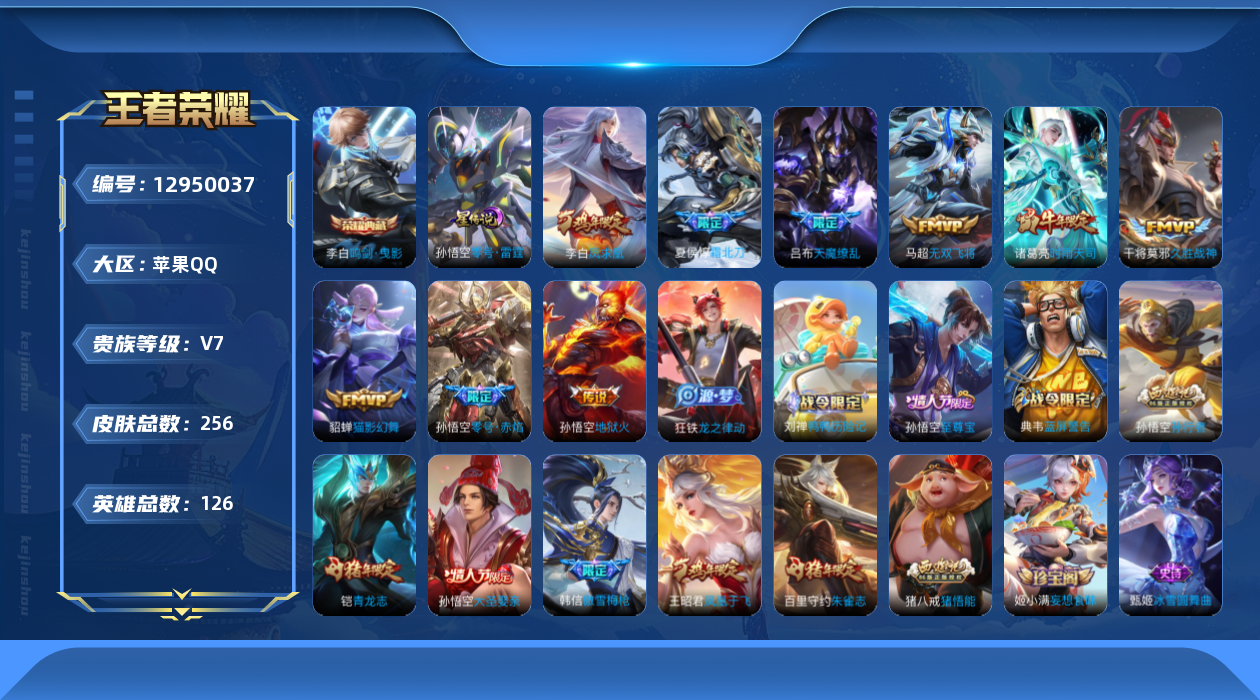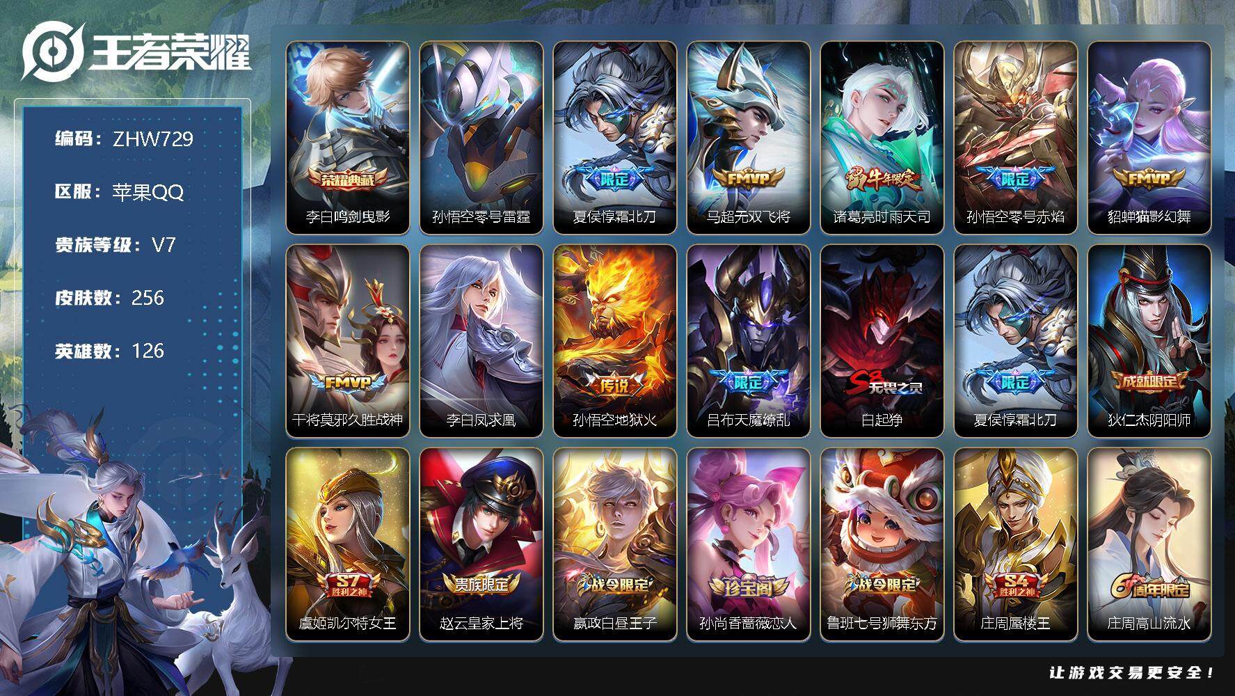 [12950037]【特价急出/详情看图】苹果Q-V7-最强王者段位-126英雄-256皮肤-1典藏-9传说-70史诗