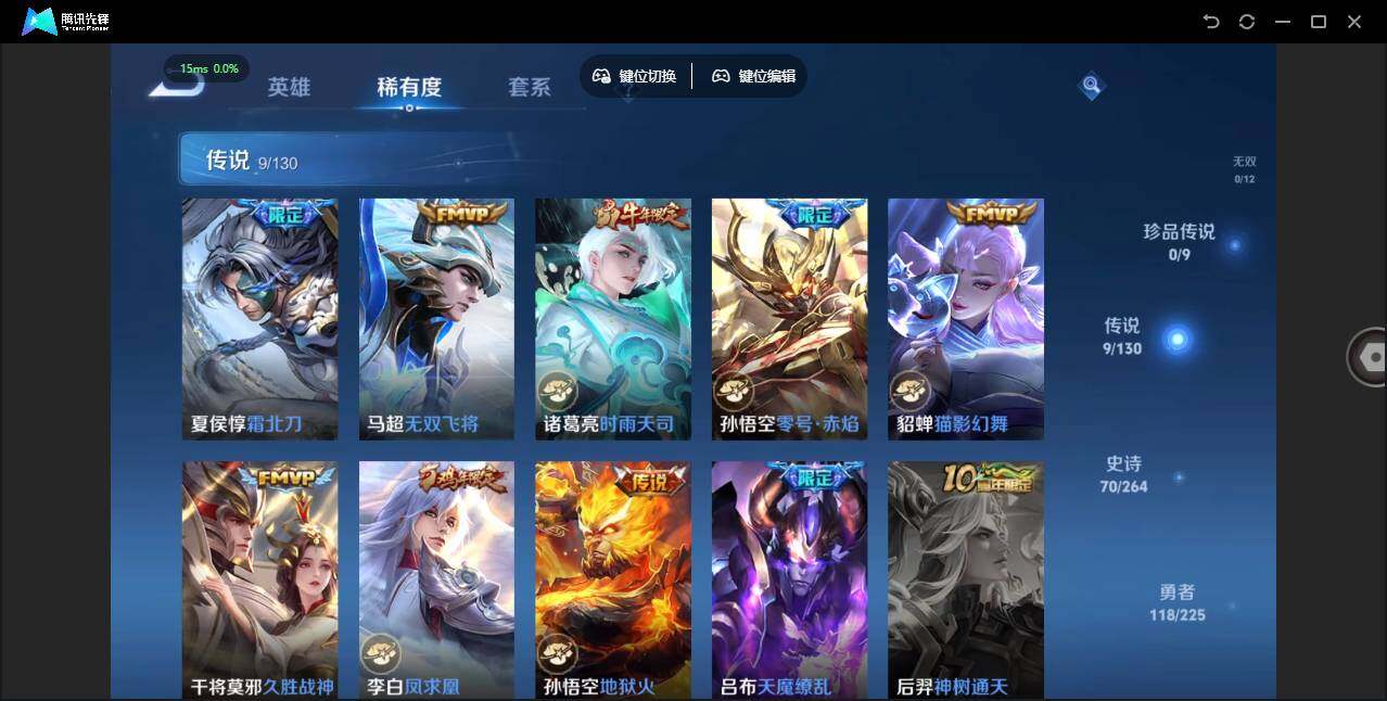 【传说皮肤】:夏侯惇霜北刀,马超无双飞将,诸葛亮时雨天司,孙悟空零号赤焰,貂蝉猫影幻舞,干将莫邪久胜战神,李白凤求凰,孙悟空地狱火,吕布天魔缭乱